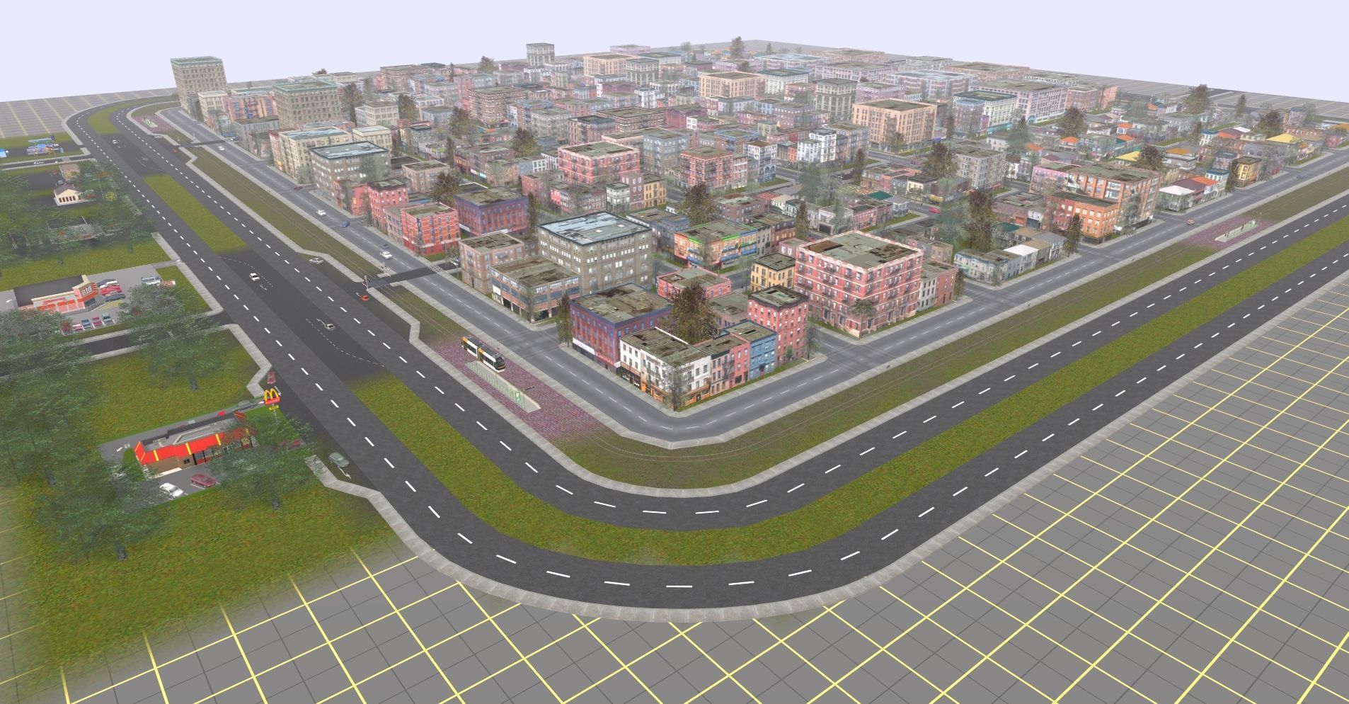 Caption: Small City with traffic controled intersections, a freeway and Tram around the city. Can be merged with your layout.