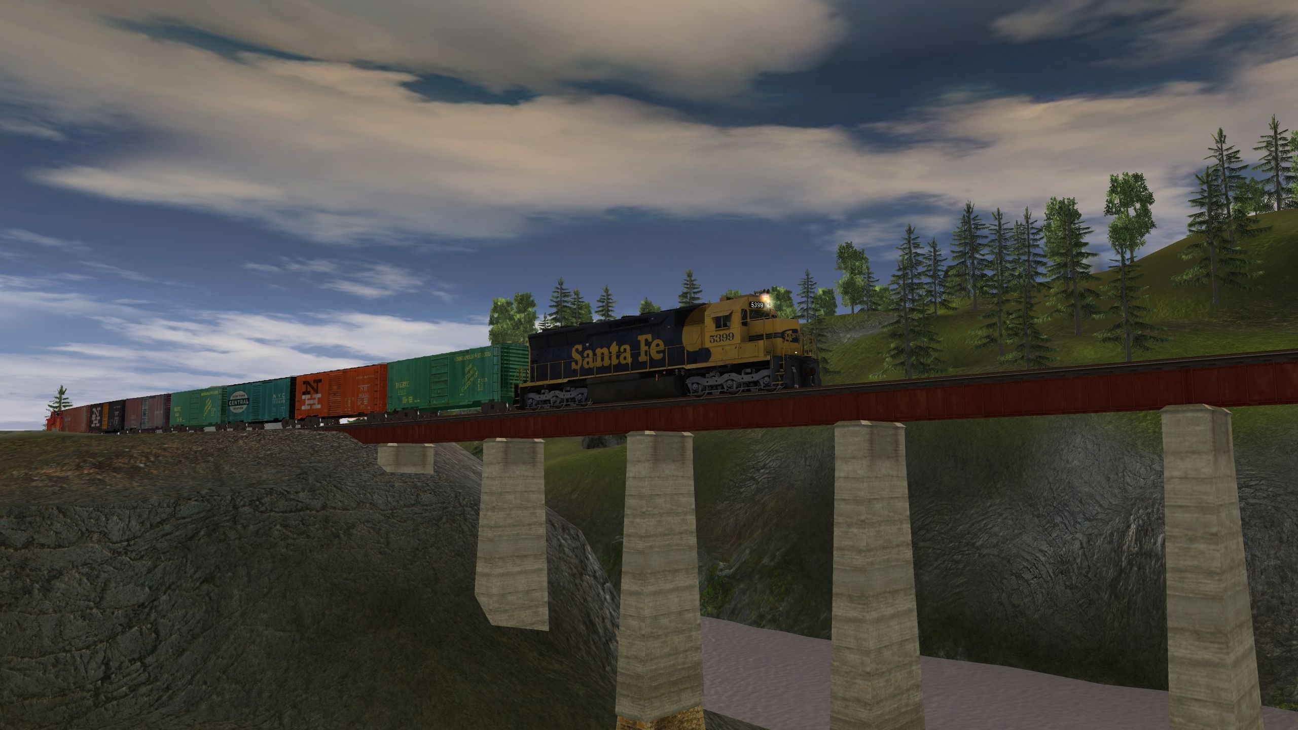 Tags: Trainz: A New Era, Kickstarter County, Morning Run, ATSF SD45, 40ft Boxcar MStL 02, 40ft Boxcar NH 02, 40ft Boxcar NYC 01, 40ft Boxcar MStL 01, 40ft Boxcar GMO 01, 40ft Boxcar NH 01, 40ft Boxcar NC&StL 01, ATSF Ce-11 Caboose, 40ft Boxcar ACL 01