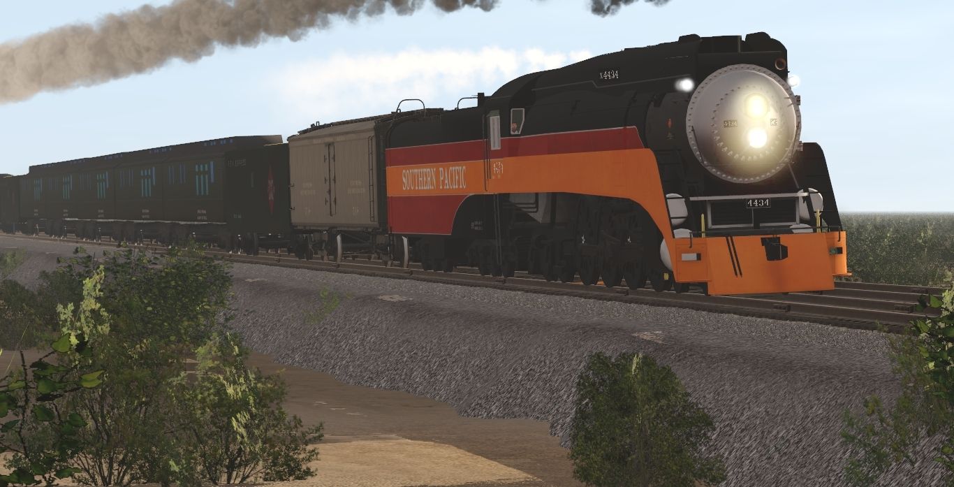 Tags: Trainz Railroad Simulator 2022, Generic Desert Route, Vintage Scenes - Early October 1952, A_Camera_00, OF SP GS-4 Daylight Engine v4, OF SP GS-4 Daylight Tender v3, REA 53' Express Reefer, REA (Ex-Troop) Express Boxcar #8249, Southern Pacific Pullman Style RPO-Baggage Combine, REA (Ex-Troop) Express Boxcar #8253, REA (Ex-Troop) Express Boxcar #8255, Southern Pacific Pullman Baggage car, SP 60-B-1/2/3/4/5/6/8 Baggage - Late, Southern Pacific Pullman Style Coach