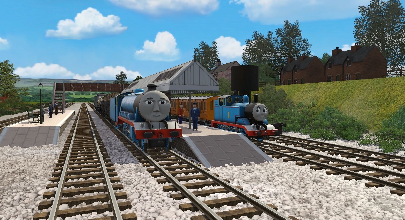 Tags: Trainz Railroad Simulator 2019, CGI | Elsbridge Station, Flying Cam, CGI No.1 - Thomas the Tank Engine - 2023, CGI No.4 - Gordon the Big Express Engine - 2023, CGI - Annie the Branchline Coach - 2023, CGI No.4 - Gordon's Tender - 2023, CGI - Clarabel the Branchline Coach - 2023, CGI Rolling Stock | Troublesome Truck (PBR), CGI Rolling Stock | Tanker 2023 (PBR), SF - CGI Salt Van, Engie's - TVS BR 20T Brakevan Type 1 (TS19)