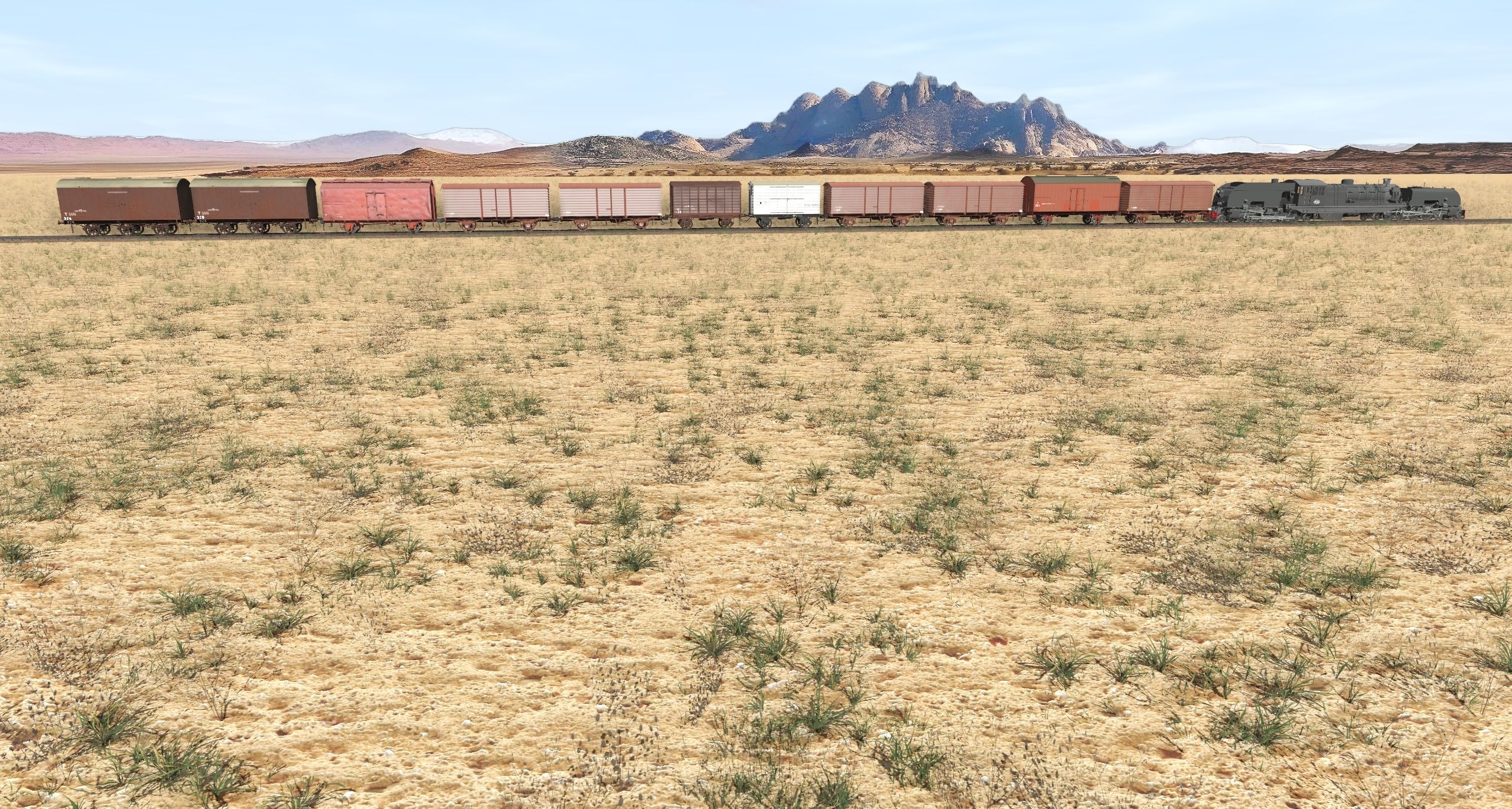 Tags: Trainz Railroad Simulator 2022, Namibia Backdrop, Default, Loco SAR 400 Garratt rear section T:ANE, Loco SAR 400 Garratt mid section T:ANE, Loco SAR 400 Garratt front section T:ANE, VR U van T2 Red 1905-1950s, VR T Wagon, VR U Van Type 2 - White, VR U T7b 1979+, VR T T3-1 1909-1933 BG, VR T insulated van - BG, VR U T7a 1979+