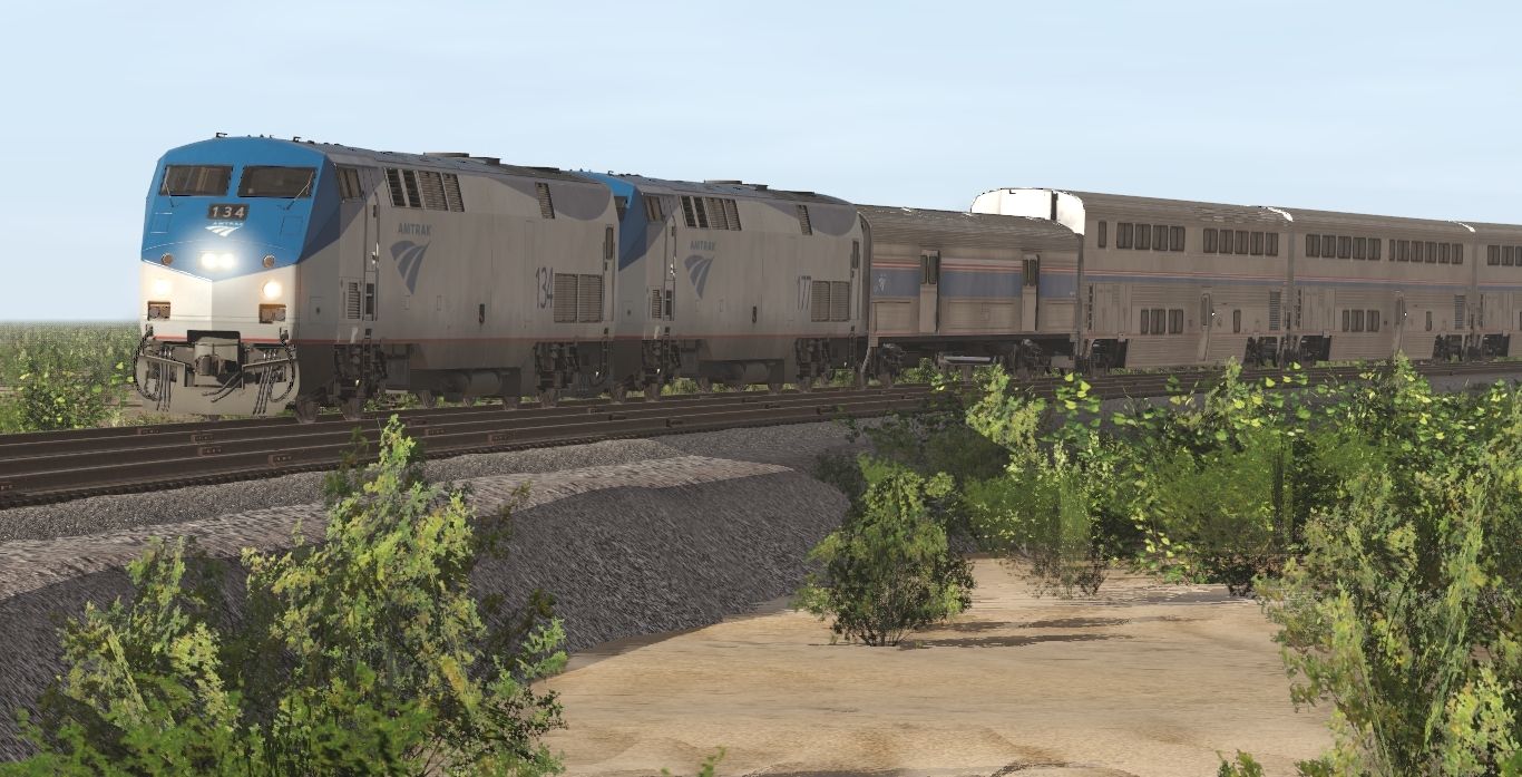 Tags: Trainz Railroad Simulator 2022, Generic Desert Route, BNSF Scenes - Late October 2009, A_Camera_00, AMTK P42DC ph V, Amtrak Heritage Baggage, Amtrak Superliner II Transition Sleeper, Amtrak Superliner II Sleeper, Amtrak Superliner II Diner, Amtrak Superliner II Lounge, Amtrak Superliner II Coach, Amtrak Superliner I Coach Baggage, up_pacific_crest, NP Budd Dome Buffet