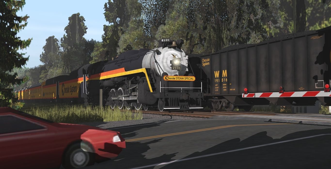 Tags: Trainz Railroad Simulator 2022, Forest Railroad Crossing for Railfanning, Chessie Steam Scenes - Late August 1978, Chessie Steam Special T1 Engine, Chessie SD40 C&O#7579, EMD SD40 B&O #7594, Chessie SD40 WM#7596, EMD SD40 C&O #7461, EMD SD40 B&O #7598, Chessie Steam Special T1 Tender, Chessie Steam Special T1 Aux Tender, Chessie Steam Special 01 Dormitory Car, Chessie Steam Special 01 Power Car, Chessie Steam Special 02 Combine