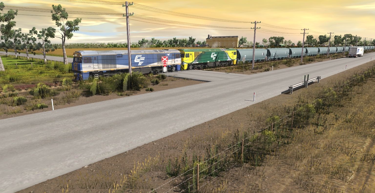 Tags: Trainz Railroad Simulator 2022, Willaroo, Australian Mainline, CFCLA GL Class, CFCLA GL Class (De-hired Freightliner livery), NGXH Grain Hopper, CFCLA CQBY Container Wagon (Series 1), NSW ARTC (V2) ADFF Ballast Wagon