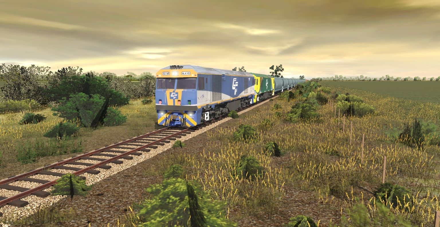 Tags: Trainz Railroad Simulator 2022, Willaroo, Australian Mainline, CFCLA GL Class, CFCLA GL Class (De-hired Freightliner livery), NGXH Grain Hopper, NSW ARTC (V2) ADFF Ballast Wagon, CFCLA CQBY Container Wagon (Series 1)