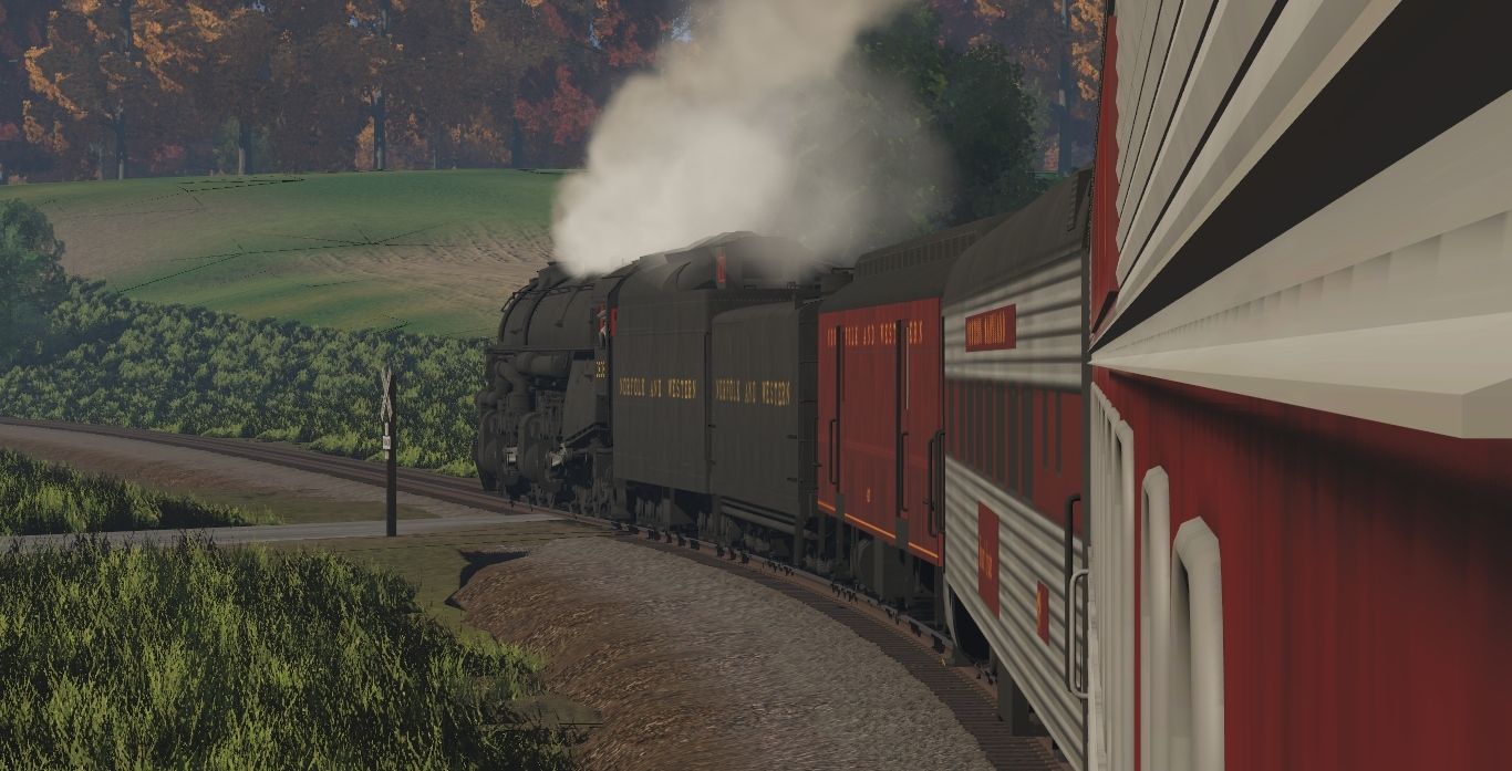 Tags: Trainz Railroad Simulator 2022, Generic Eastern Route - TRS 19, NS Steam Scenes - Mid November 1991, N&W A Class Engine V1, NGRX Lounge Budd Silver, RF&P Coach #840, WMSR Coach 850 Howard O Hovatter, NYC Lightweight Budd Coach, N&W Tool Car #1407, TVRM Coach Lounge, N&W A Class Aux Tender, N&W NS Powhatan Arrow 01 P1 Locker Car 502, N&W A Class Tender, SOU HW Harriman Baggage Car NRHS 534