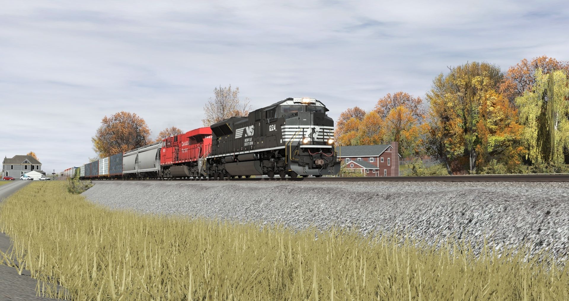 Tags: Trainz Railroad Simulator 2022, Norfolk Southern V1.0, Default, NS SD70IAC, CP ES44AC, NS SD60E, BNSF 73ft Centerbeam (safety stripes) v2, CSXT 73ft Centerbeam black (safety stripes), BN #455335 3 Bay ACF, BN ACF Centerflow 3 Bay long hatch, CHSX 23K FF Tank Car Clean, CP Trinity 3 Bay Hopper, TTZX 73ft Centerbeam (safety stripes), 52ft Gondola DJJX