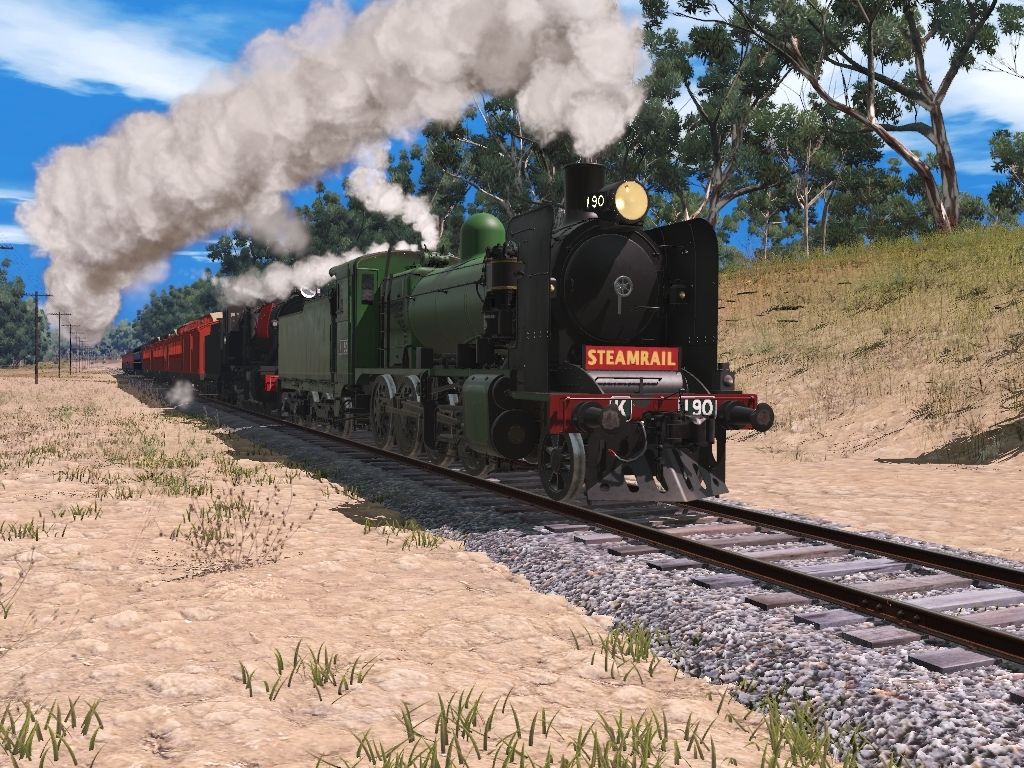 Tags: Trainz Railroad Simulator 2022, Bairnsdale to Orbost Line C1970-80s, Quick Drive Session, VR K190 2tg 86-93, VR K190 2tg Ten 86-93, VR J class loco 09 (coal), VR J class tender 09 (coal), VR BCE car 4-5, VR BW car T1 - 1954-1971 BG, VR SOP VRS Buffet car, VR ABL T1 1910-1954 carriage