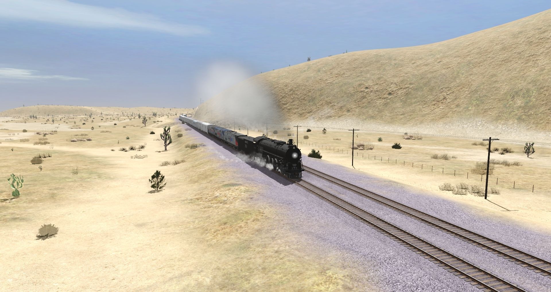 Tags: Trainz Railroad Simulator 2019, Mojave Sub Division, ATSF_2929, Amtrak GE P42 156 I 40th Anv., AMTK P42DC 189, AMTK P40DC Exhibit Train phIII, MP40PH-3C NMRX, Rail Runner BBL Cab Car, ATSF_2929 Tender, ATSF Baggage Car 77, ATSF SS Pullman - Pine series, ATSF 4-4-2 lightweight sleeper, ATSF SS Bar-Lounge