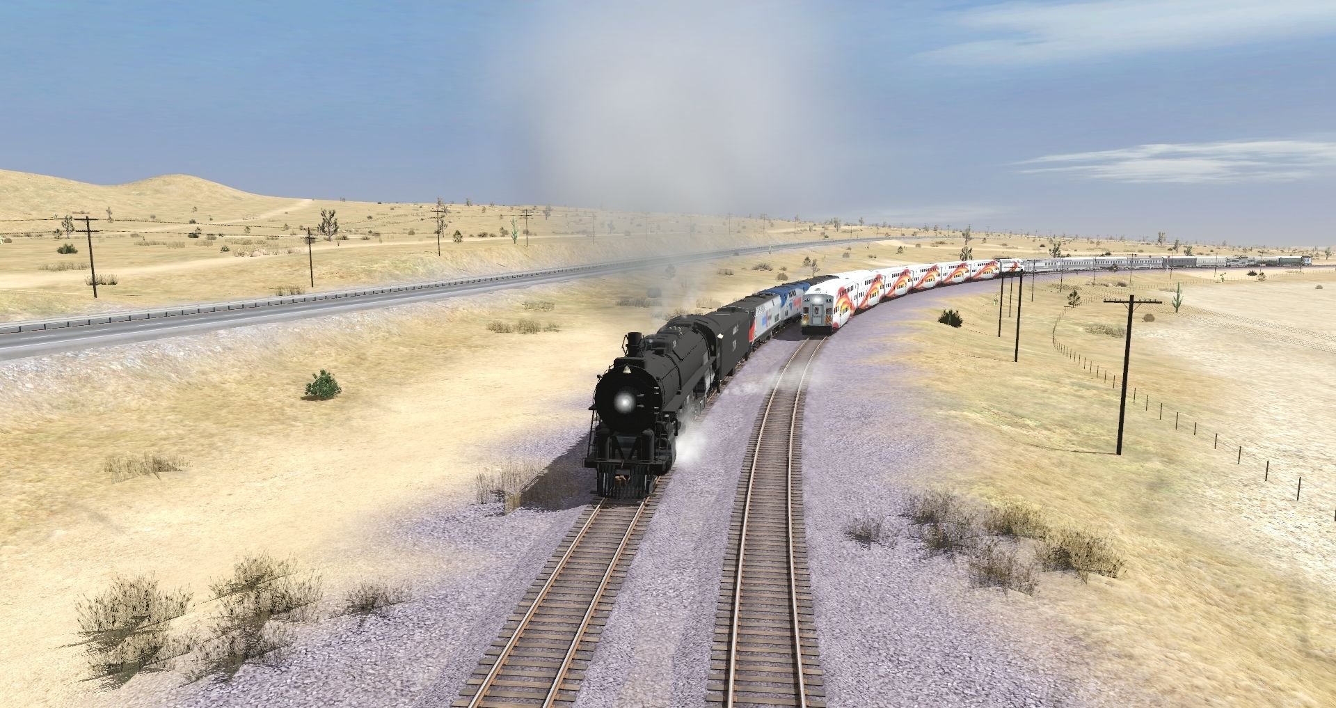 Tags: Trainz Railroad Simulator 2019, Mojave Sub Division, ATSF_2929, Amtrak GE P42 156 I 40th Anv., AMTK P42DC 189, Rail Runner BBL Cab Car, AMTK P40DC Exhibit Train phIII, MP40PH-3C NMRX, ATSF_2929 Tender, ATSF Baggage Car 77, ATSF SS Pullman - Pine series, Rail Runner BBL Coach Car, ATSF 4-4-2 lightweight sleeper