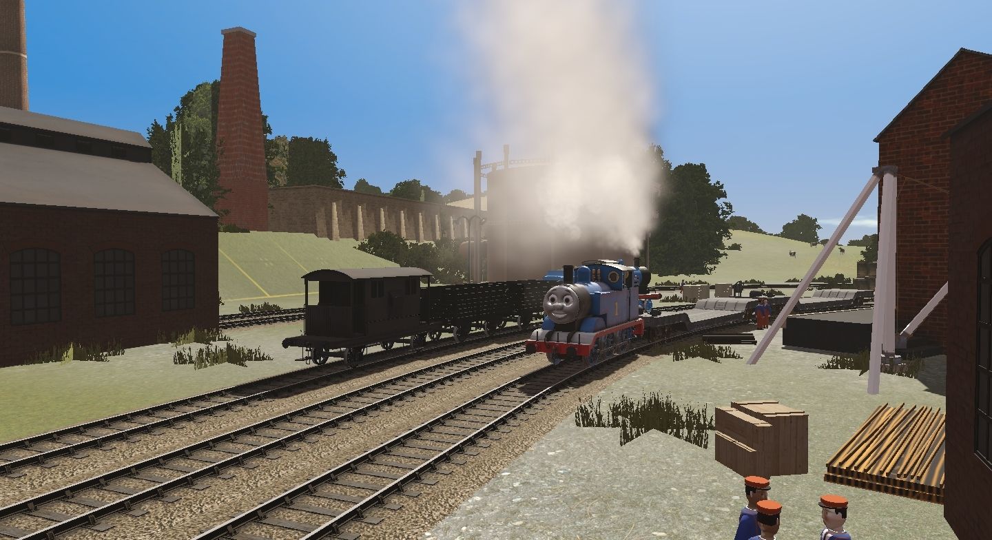 Tags: Trainz Railroad Simulator 2022, Knapford Shunting Yards, Default, TTTE - Thomas The Tank Engine [TRS19], Edward the Blue Engine, Sodor Brake Van Type 1a, Troublesome Truck - Brown (Large Face), Flatcar Depressed Center 55 ft UP DES, Edward's Tender