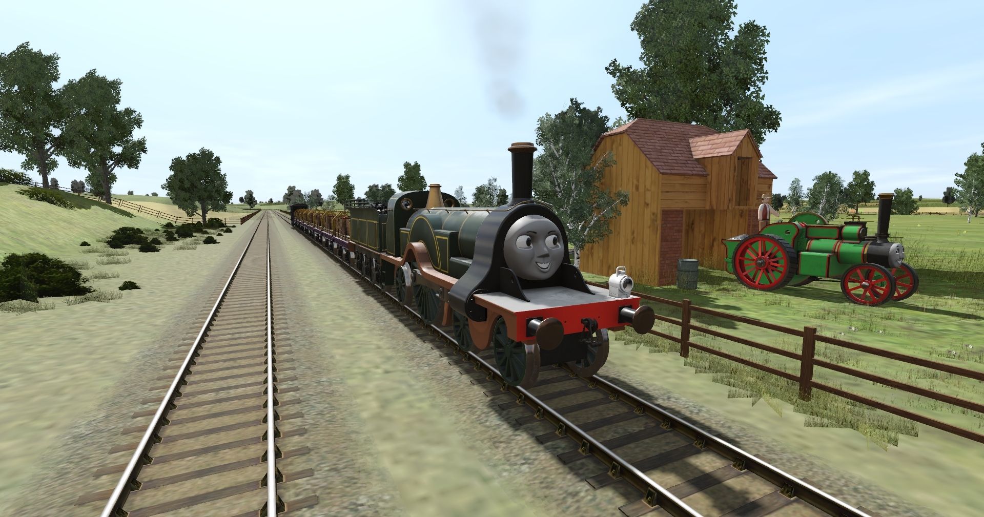Tags: Trainz Railroad Simulator 2019, Island of Sodor, Default, Flying Cam, TTTE - Emily the Emerald Engine (TSI), TTTE - Emily's Tender (TSI), TTTE - Trevor The Traction Engine (Jackie), TMPD - Apple Car, TTTE - Sodor Brake Van Type 1a (#1TFM)