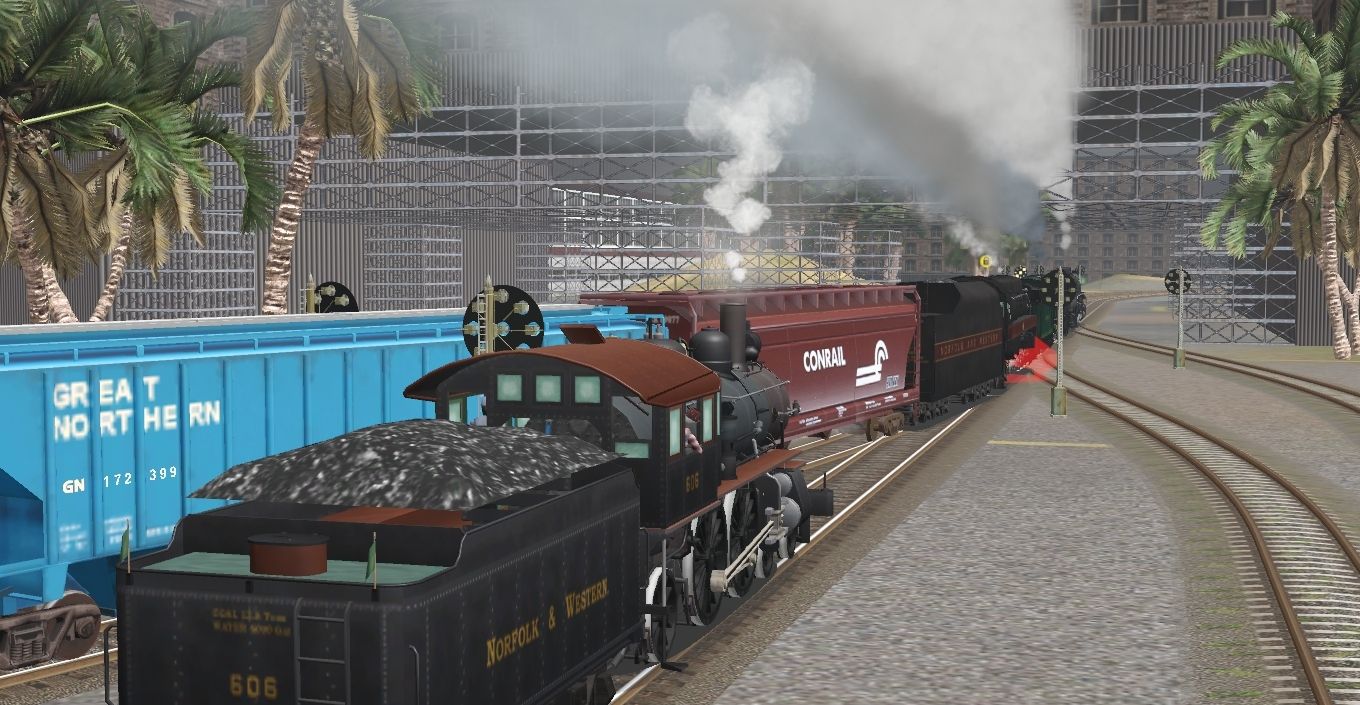 Tags: Trainz Railroad Simulator 2019, Harbor Town, N&W Class J 606, N&W Class J 600, Timken 1111 Tender, Timken 1111, SP SP-1 Prewar Russia Iron, N&W Class J 606 tender, TUME-300551-Covered-Hopper-MILW, TUME-300503-Boxcar-50ft-MILW, TUME-300555-Covered-Hopper-GN, Texaco 3-dome HW tank, 4Bay HopperConrail89077(LARS)