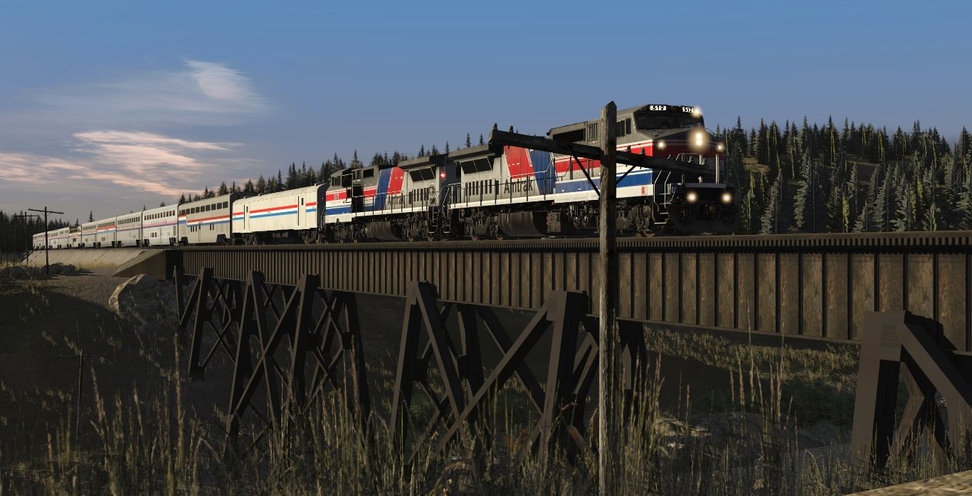 Tags: Trainz Railroad Simulator 2022, BN Oasis V3, SP Scenes - Late September 1995, Amtrak B32-8WH Phase III 500-519 1, Amtrak HEP Baggage 1178-1195, AMTK Hi-Level Transition Car Ph III (Superliner), Superliner II Coach 34120, Amtrak IV Coach Baggage Superliner, Amtrak III Coach Superliner, Amtrak IV Coach Superliner, AMTK Hi-Level Lounge Car Ph III (Superliner V2), Amtrak IV Diner Superliner, Superliner II Sightseer Lounge 33049, 40ft Boxcar NP