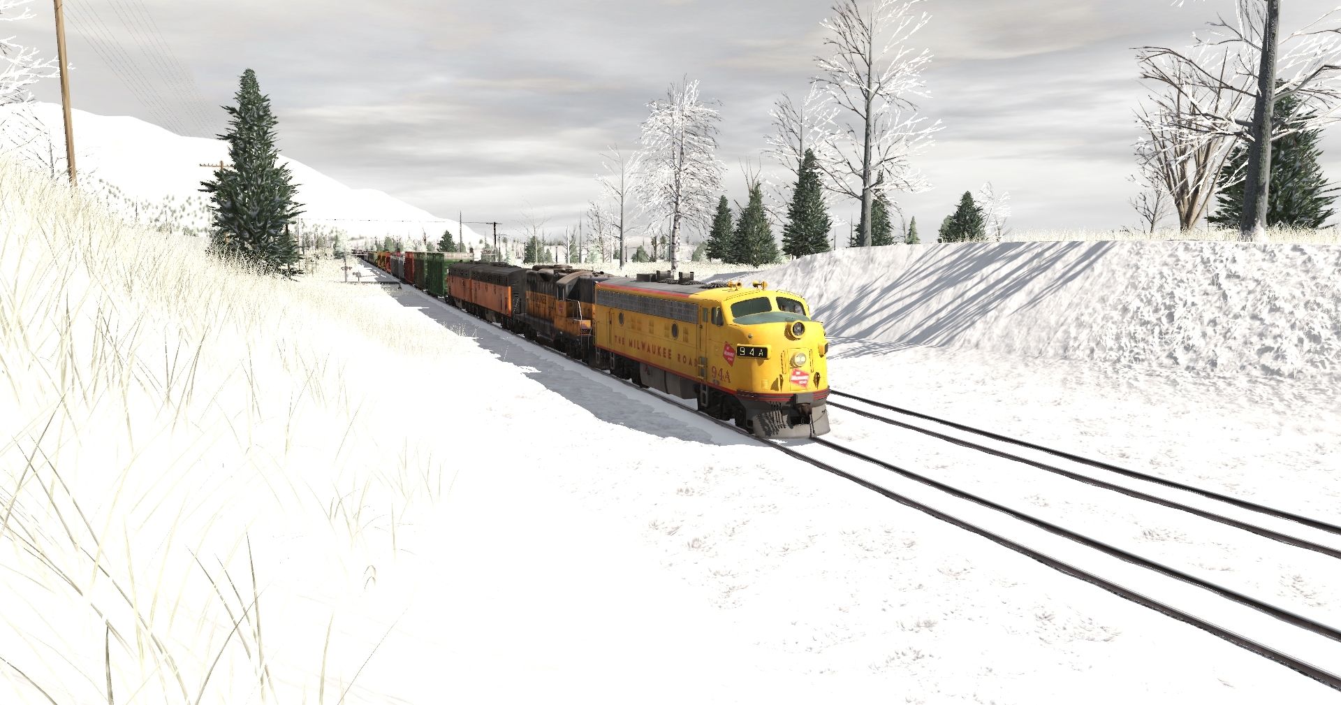 Tags: Trainz Railroad Simulator 2022, Centrella Sub Division - TRS19, Default, MILW F9A A UPY, MILW GP9 high hood (lettering), MILW F7B Ph 1c, MILW F7A Ph 1c, JR 50ft Boxcar CHAT #1, JR 50ft Boxcar CAGX #1, JR 50ft Boxcar AOK #2, 2bay_h49 41' Coverd Hopper USLX v1, 2bay_h49 41' Coverd Hopper USLX v2, 2bay_h49 41' Coverd Hopper USLX v3, 73ft Centerbeam GTW 2