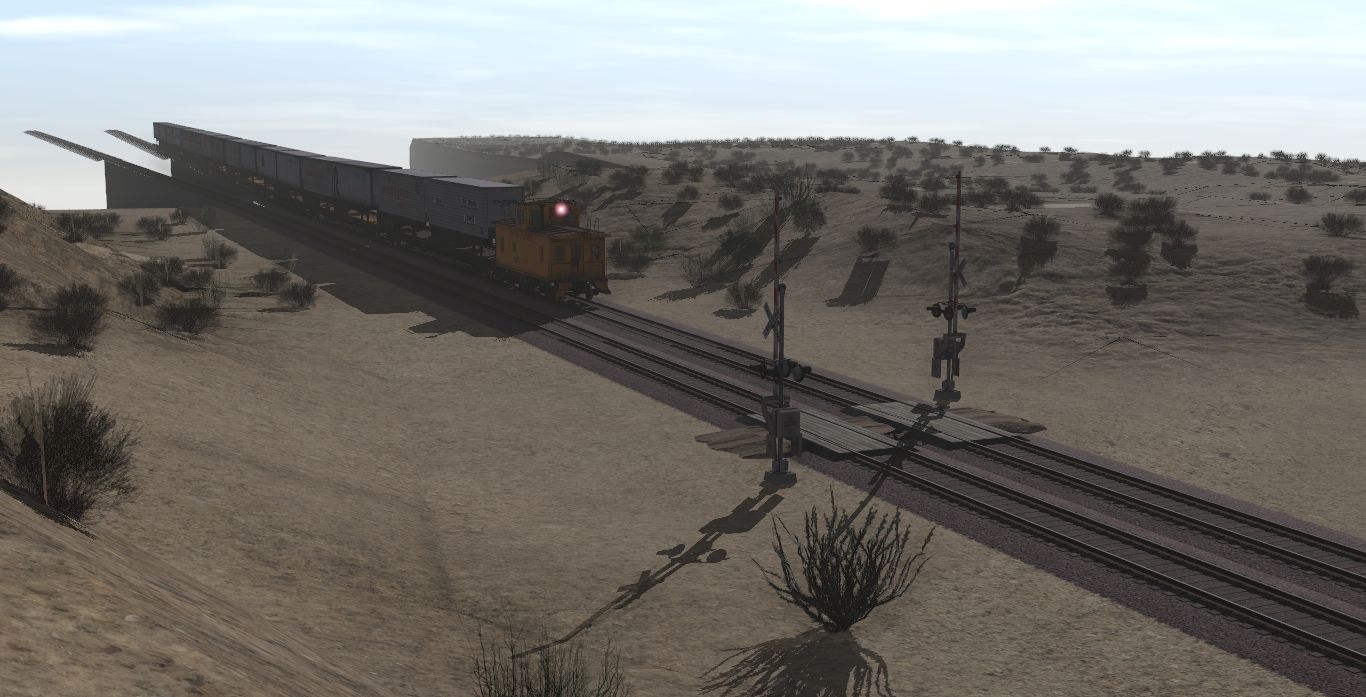 Tags: Trainz Railroad Simulator 2022, Cajon Subdivision - 1990 Part 1: The Pass, 1970's Scenes - Late August 1973, UP CA-3 Caboose Yellow Late, TTX F89F Flat 89 TOFC Trailer Train Oxide Red, TTX F89F Flat 89 TOFC Trailer Train, TTX F89F Flat 89 TOFC