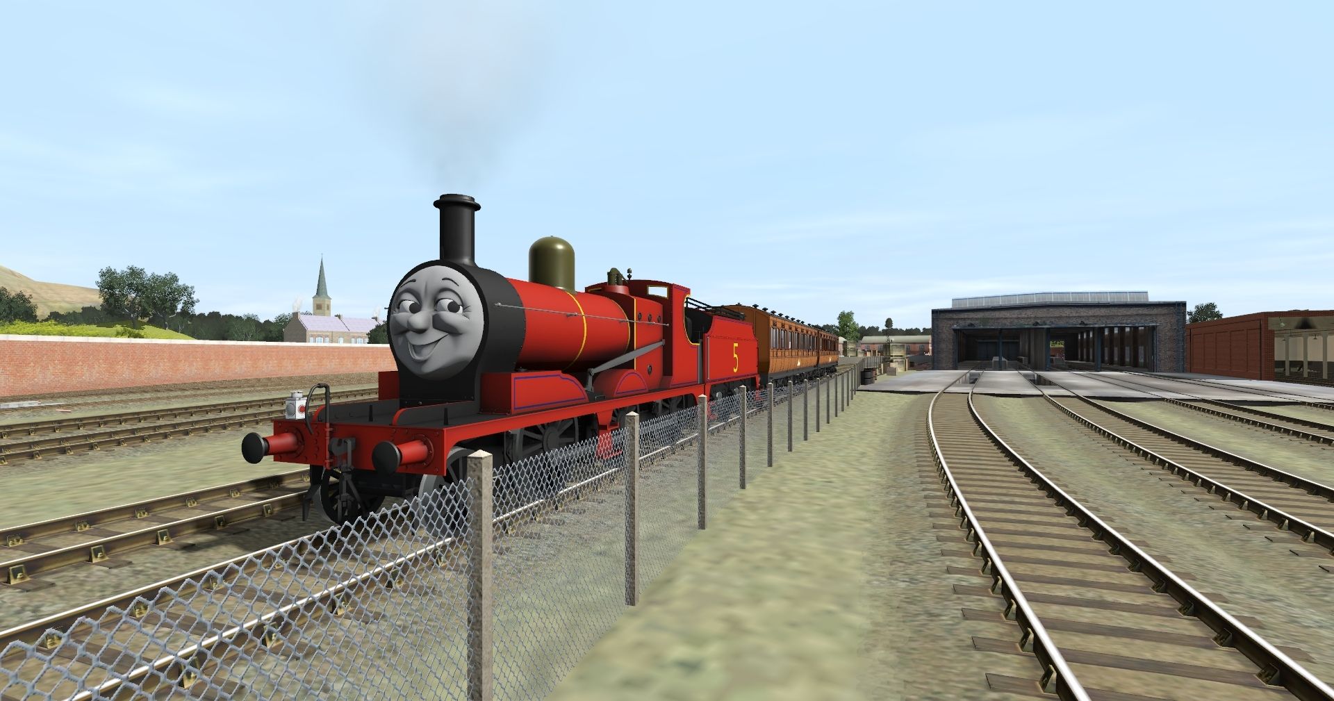 Tags: Trainz Railroad Simulator 2019, Island of Sodor, Default, Flying Cam, TTTE - James the Red Engine (1964-2012) (Sandboxes) (RWS) (WNW), TTTE - James' Tender (1964-2012) (RWS) (WNW), TTTE - Annie the Coach (RWS) (SW), TTTE - Clarabel the Coach (RWS) (SW)