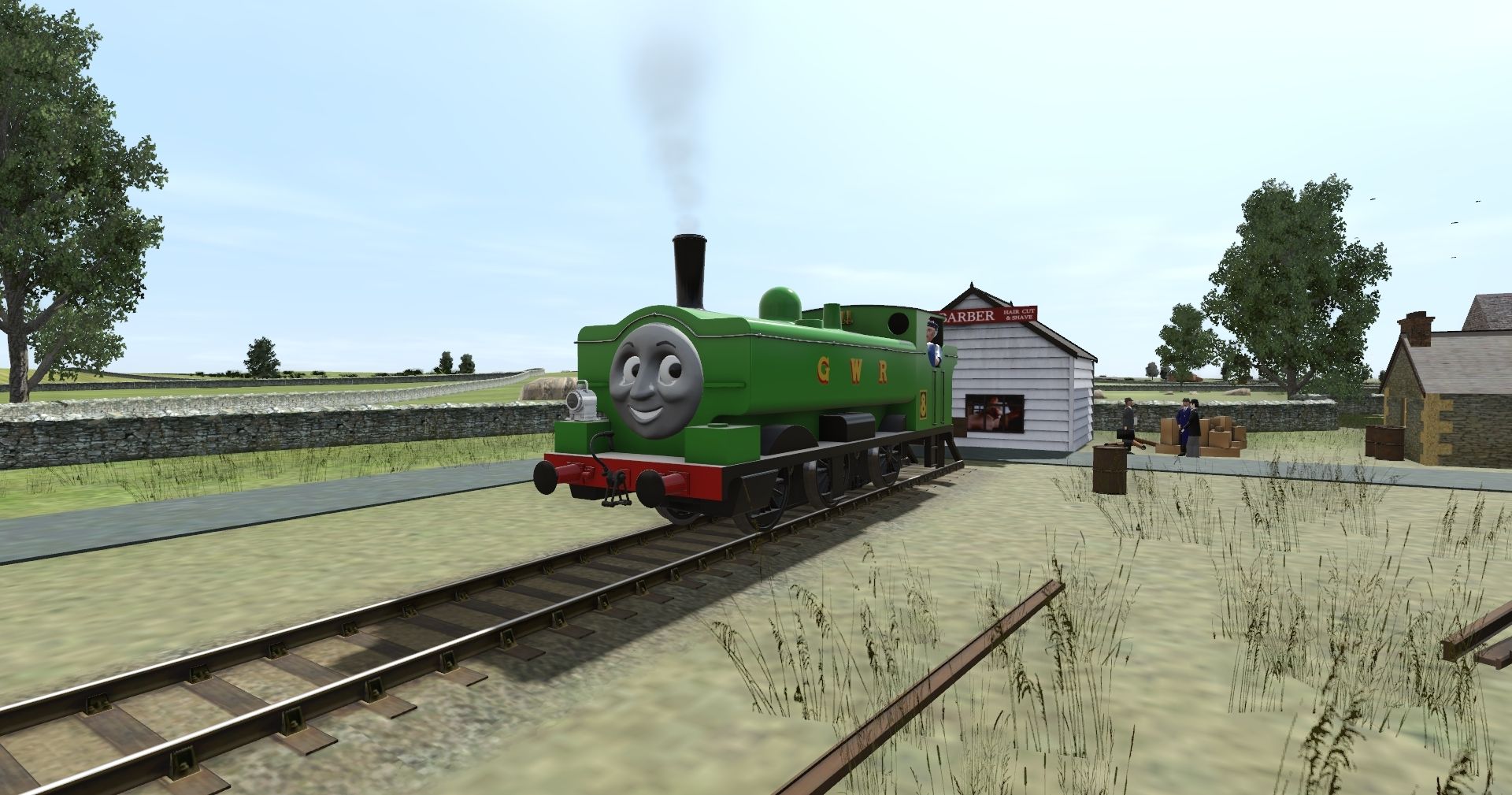 Tags: Trainz Railroad Simulator 2019, Island of Sodor, Default, TTTE - Duck the Great Western Engine (Sodor Workshops Modified), Flying Cam