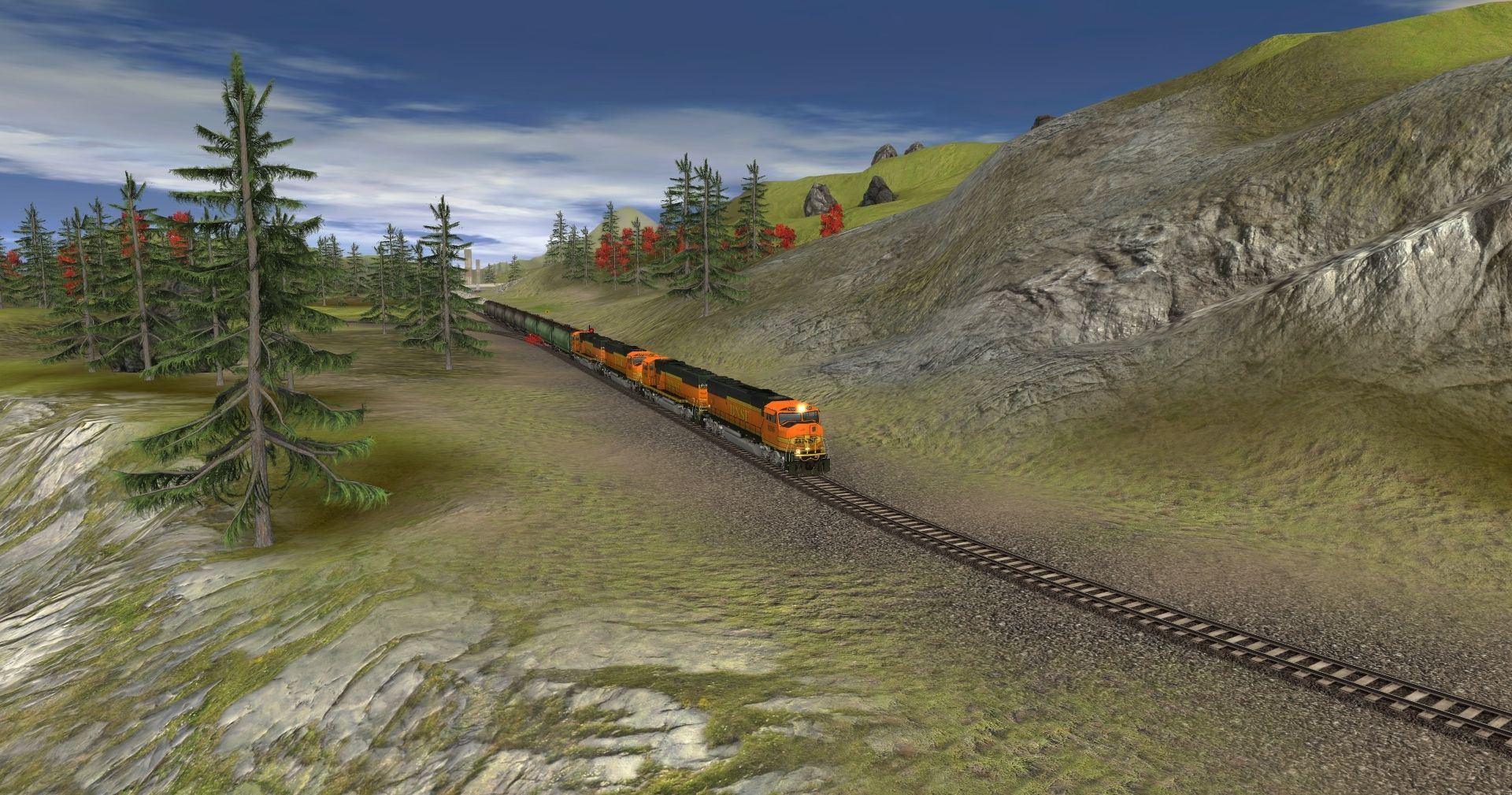 Tags: Trainz: A New Era, Kickstarter County, BNSF SD60M heritage, GBCX Cylindrical Hopper, ACFX (dirty) Cylindrical Hopper, Cylindrical Hopper - Cotton Belt