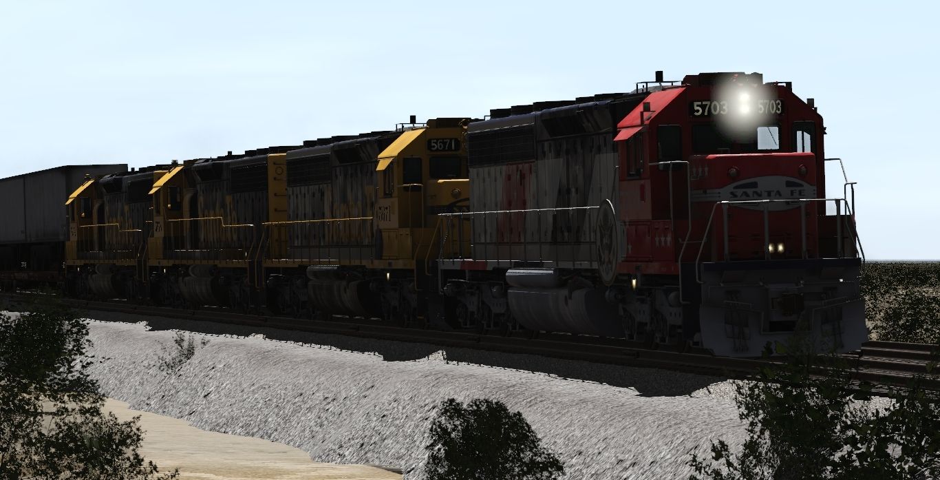 Tags: Trainz Railroad Simulator 2022, Generic Desert Route, 1970's Scenes - Early October 1975, A_Camera_00, ATSF SD45-2 Bicentennial, ATSF SD45-2 blue/yellow warbonnet, TTX 89ft ACF AP TOFC Flatcar ASH10A (Brown), TTX 89ft PS AP TOFC Flatcar PSH10A (Brown), APLX 89ft AP TOFC Flatcar, WP 89ft AP Flatcar Yellow, SP 89ft AP TOFC Flatcar F-70-86, TTX F89F Flat 89 TOFC, TTX F89F Flat 89 TOFC Trailer Train Oxide Red, TTX 89ft AP TOFC Flatcar TTWX
