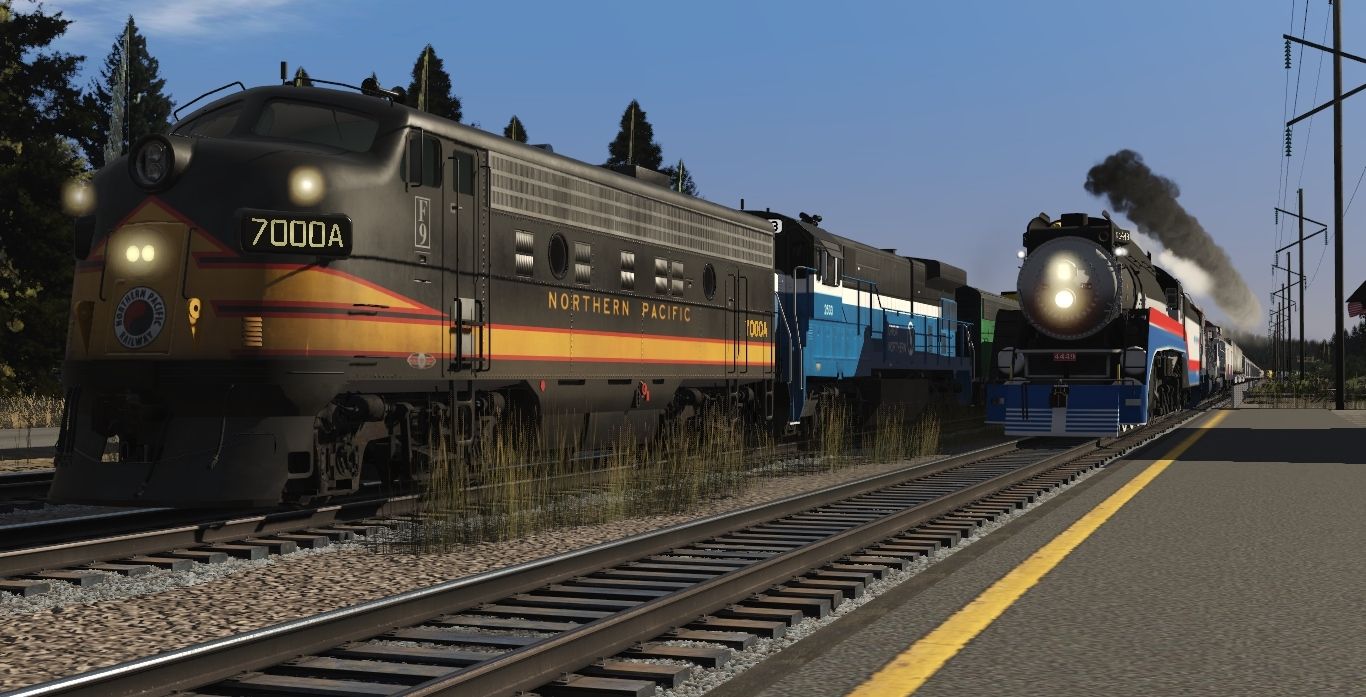 Tags: Trainz Railroad Simulator 2022, BN Oasis V3, 1970's Steam Scenes - Late October 1975, OF SP GS-4 AFT 1976, NP F9A Freight, GN U33C U33C #2533, Great Northern Class S-2 4-8-4, BN SD40-2 #1876 bicentennial V2 Dirty Version, BN F7B #675, CR U34CH #1776, np_sd45_late, GN EMD F7A Late Two Light, OF SP GS-4 AFT Tender 1976 - 2001, Great Northern Class S-2 Tender