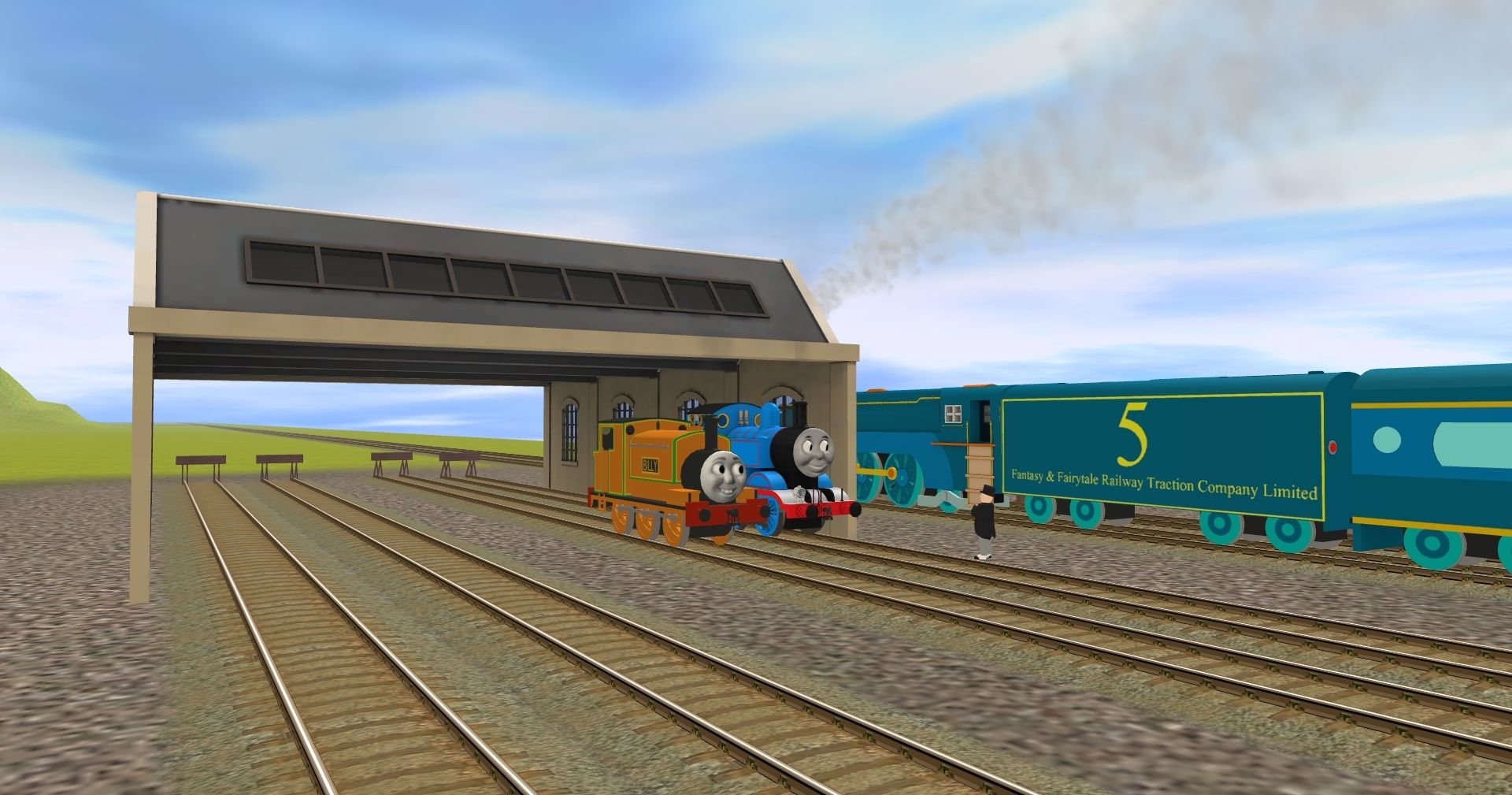 Tags: Trainz: A New Era, Knapford Layout, Default, BB3D - Billy (TVS), Si3D - Thomas The Tank Engine 2012, Montana the Streamline Express Engine, Montana's Coach, Montana's Tender