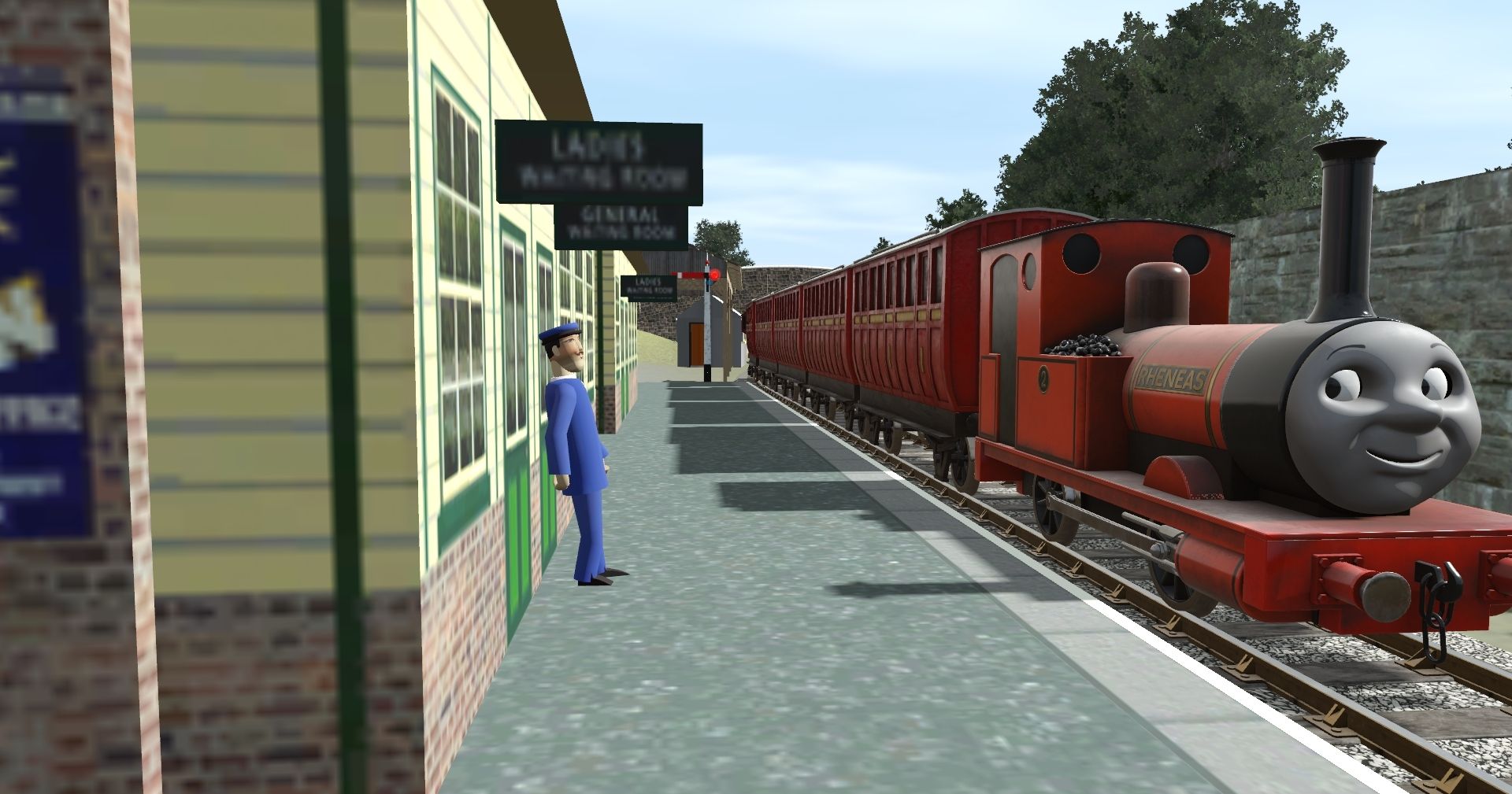 Tags: Trainz Railroad Simulator 2019, Mercy's Sodor, Default, TTTE - Rheneas the Gallant Engine (TSI) (S4), TTTE - Narrow Gauge Coach (Red) (TSI) (S4), TTTE - Narrow Gauge Brakevan (S4)