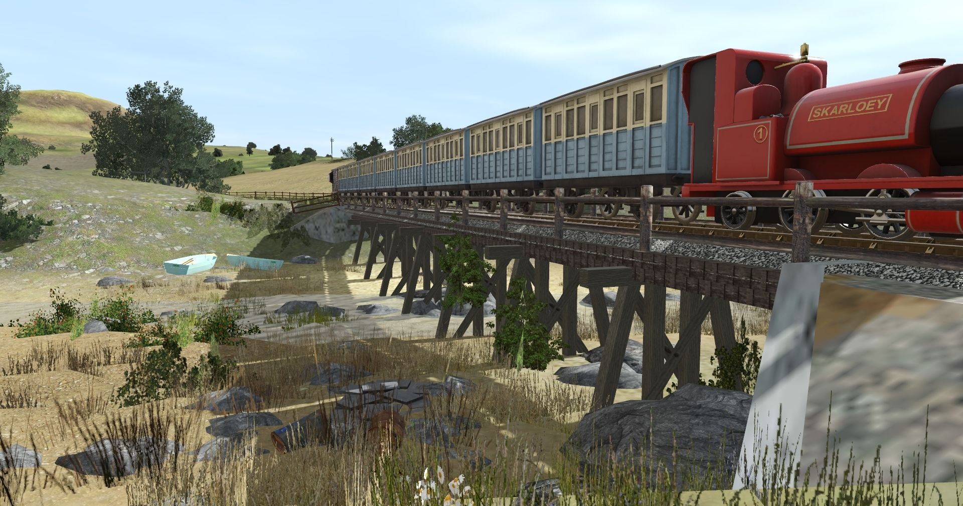 Tags: Trainz Railroad Simulator 2019, Mercy's Sodor, Default, TTTE - Skarloey the Little Old Engine (TSI), TTTE - Narrow Gauge Coach (Blue) (TSI) (S4), TTTE - Narrow Gauge Brakevan (S4)