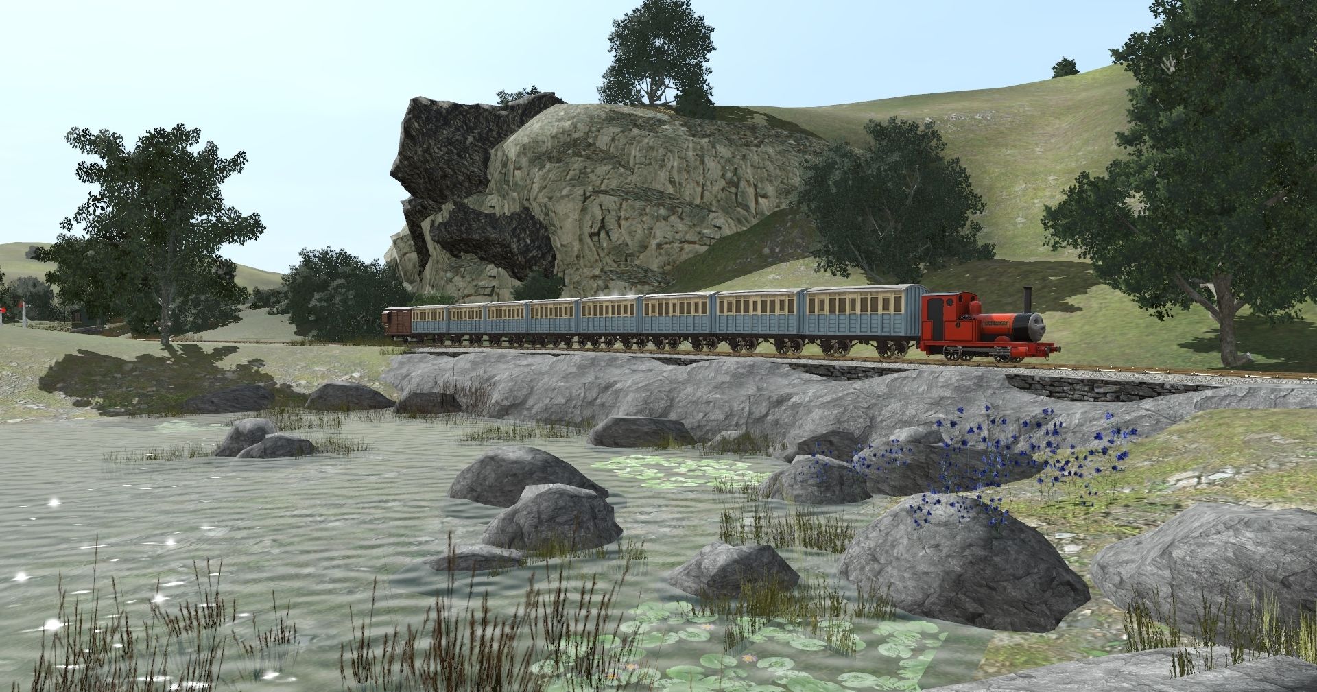 Tags: Trainz Railroad Simulator 2019, Mercy's Sodor, Default, TTTE - Rheneas the Gallant Engine (TSI) (S4), TTTE - Narrow Gauge Coach (Blue) (TSI) (S4), TTTE - Narrow Gauge Brakevan (S4)