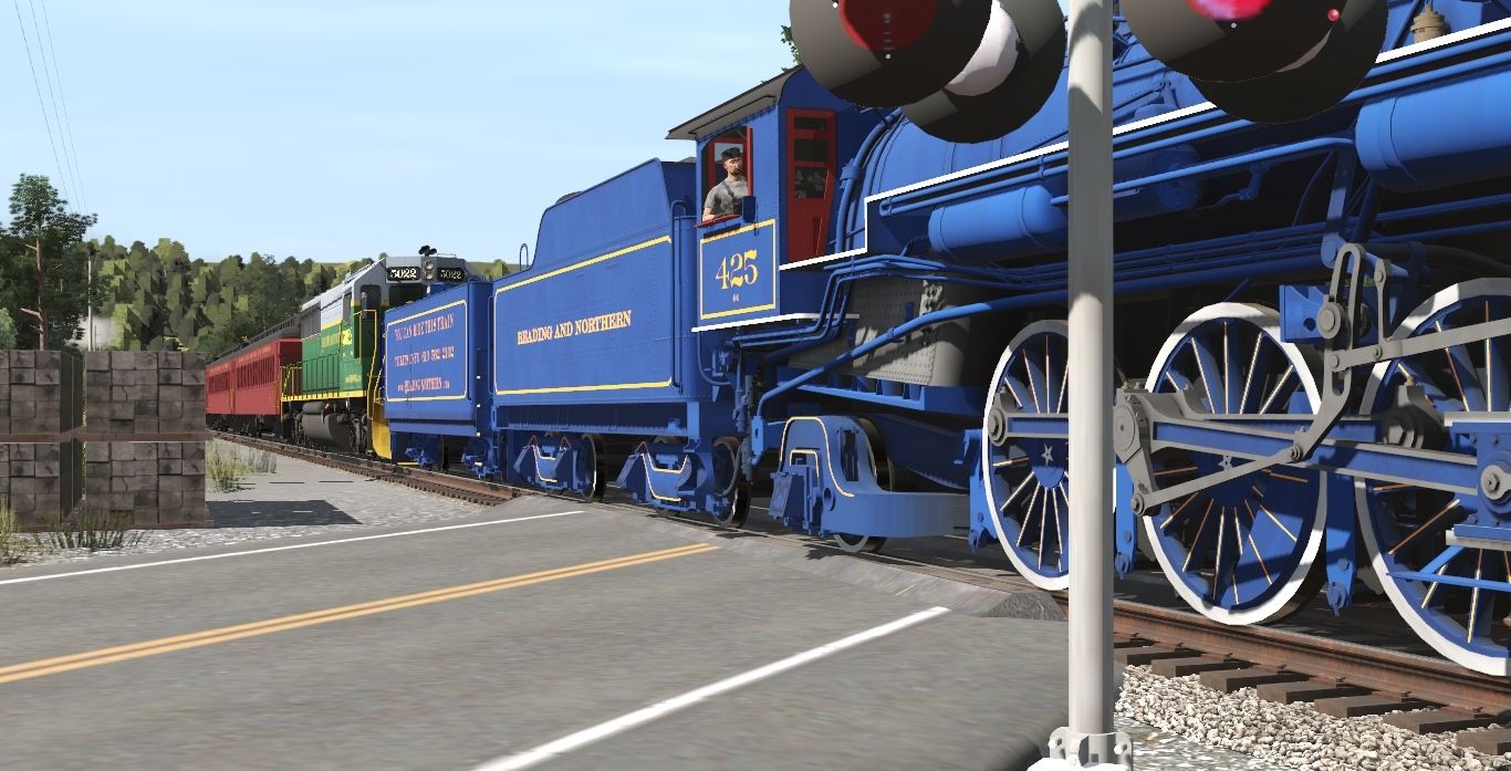 Tags: Trainz Railroad Simulator 2022, READING & NORTHERN TRS19 (pre-2020), R&N Steam Scenes - Late June 2008, RBMN SD50, R&N 425 Engine V3, R&N 425 Aux Tender V3a, R&N 425 Tender V3, Invisible Train, R&N Coach Red, R&N Pullman Sleeper Red, R&N Observation Coach Red, R&N Super Dome Red, R&N Observation Pullman Red
