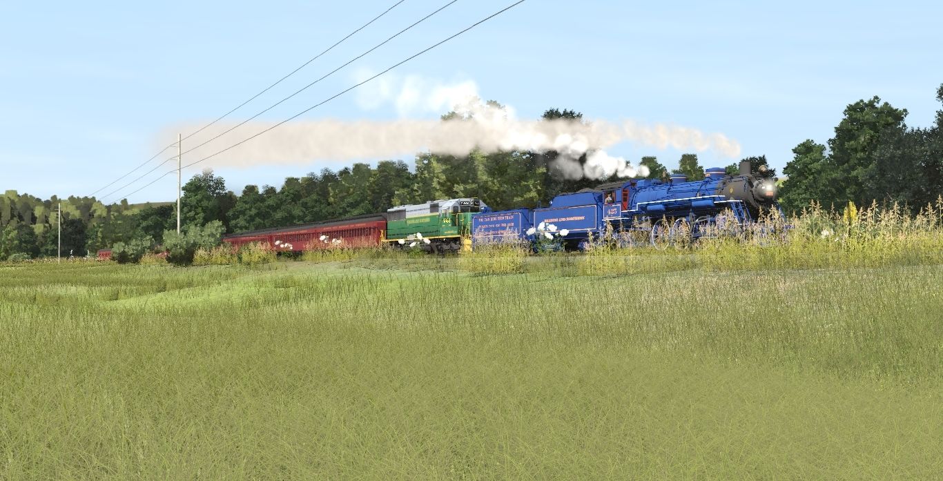 Tags: Trainz Railroad Simulator 2022, READING & NORTHERN TRS19 (pre-2020), R&N Steam Scenes - Late June 2008, R&N 425 Engine V3, RBMN SD50, R&N 425 Tender V3, R&N 425 Aux Tender V3a, R&N Coach Red, R&N Pullman Sleeper Red, R&N Observation Coach Red, R&N Super Dome Red, R&N Observation Pullman Red, Invisible Train, Bethgon RBMN