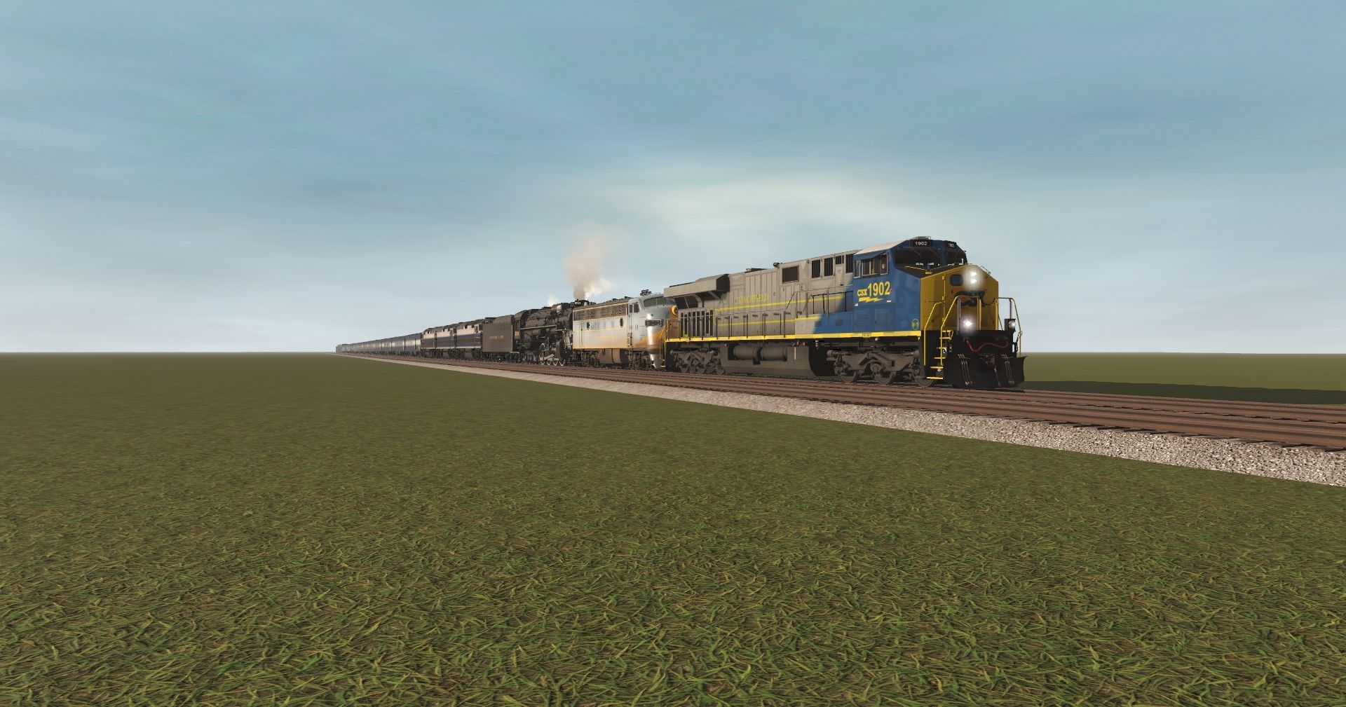 Tags: Trainz Railroad Simulator 2022, CSX Hump Yard Template, Default, CSX ES44AH 1902 Clinchfield Heritage, CRR F3Au #800 Grey/Yellow Modified Clean, C&O Kanawha K-4 Steam, CSX F40PH B&O 1-3, C&O Kanawha K-4 Tender, CSX Business Train 01 Dorm, CSX Business Train 03 Coach, CSX Business Train 04 Coach, CSX Business Train 05 Coach, CSX Business Train 06 Coach, CSX Business Train 07 Coach