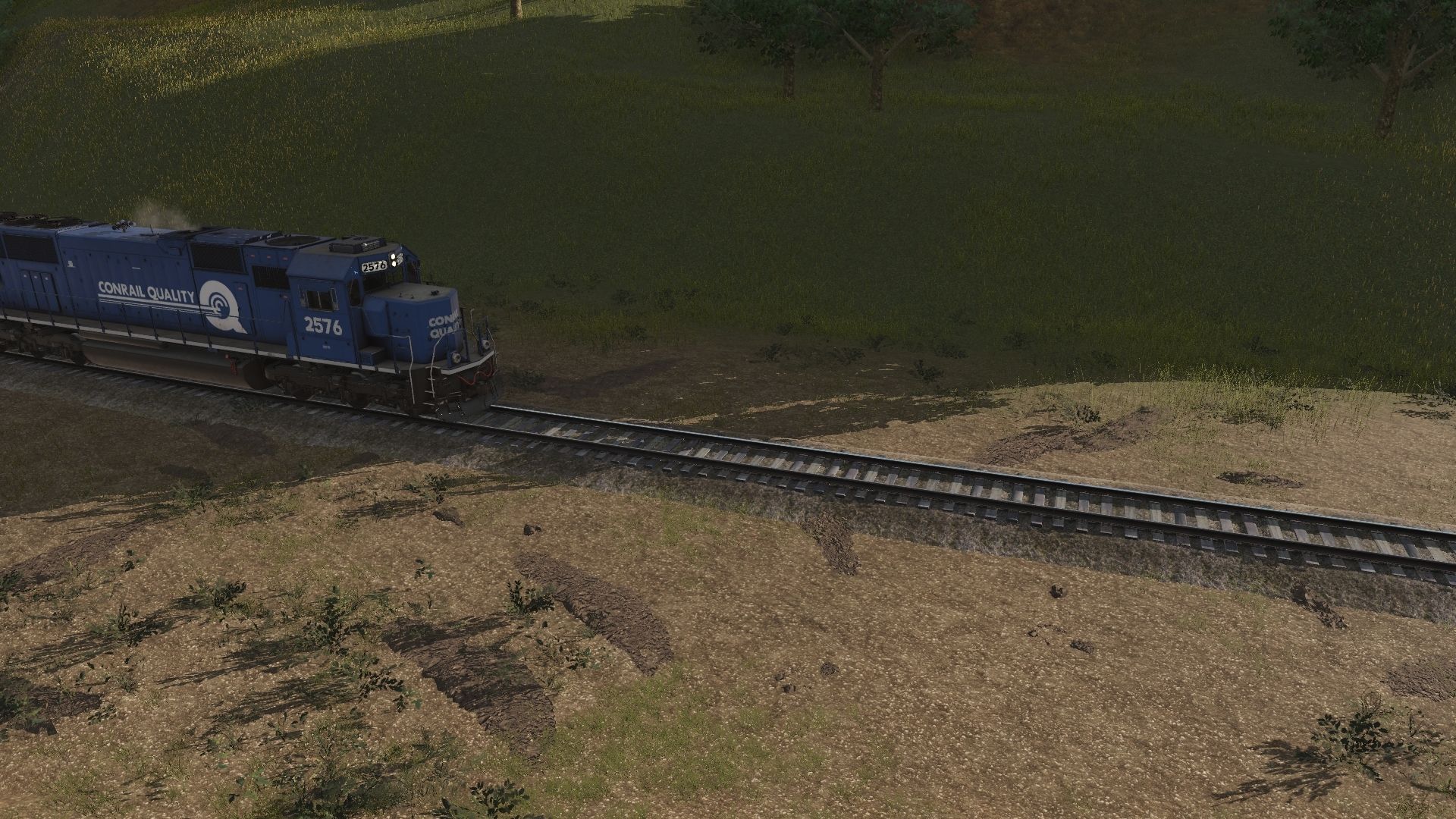 Tags: Trainz Railroad Simulator 2022, Kickstarter County 2 (TRS22), Kickstarter County 2 (TRS22) - Default, CSX GP40-2 YN3, CN SD40 ph2 no dyn, EMD MP15AC SOO #1555, CSX GP40-2, NW SD40-2 (Late) 1625-1635 1, NS SD60E, NS SD40-2 2a1, CR SD70, SP SD45, Bogie Log Wagon Short Knuckle, PROX 23000 gal Funnel-Flow tank car black