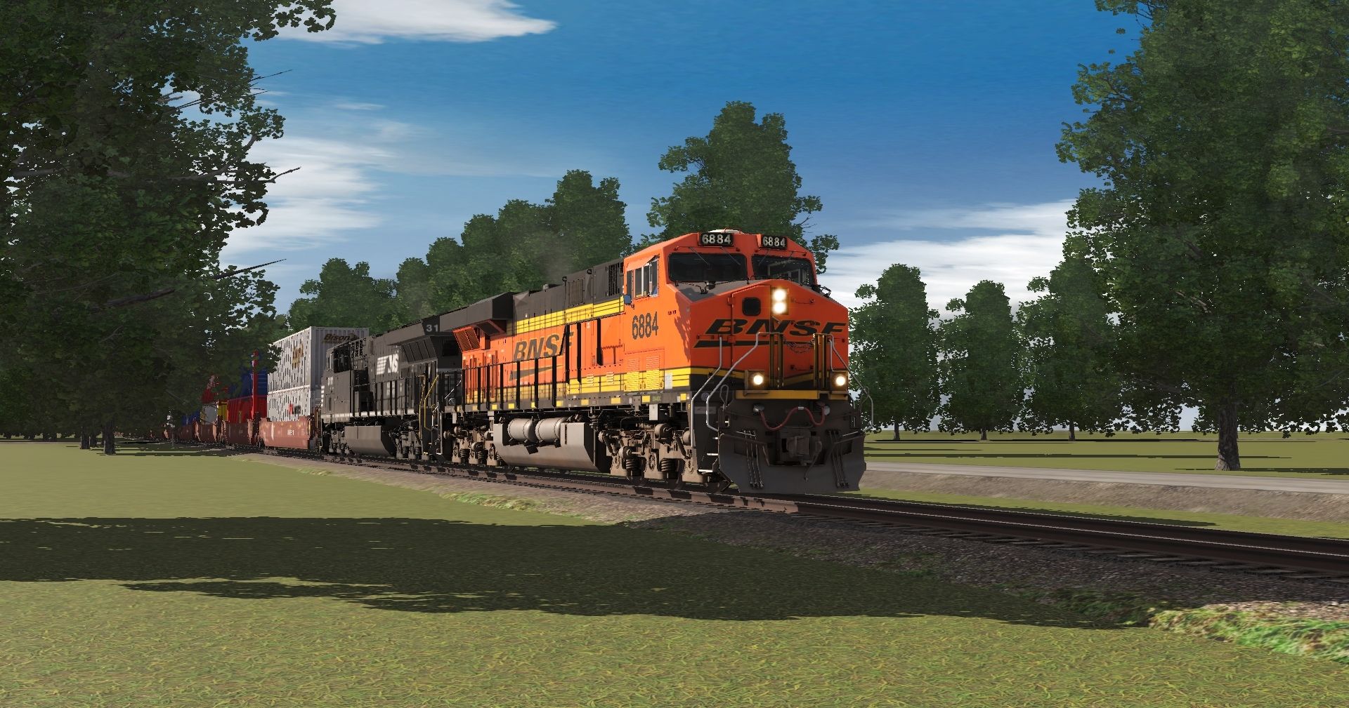 Tags: Trainz Railroad Simulator 2022, REAA, Default, BNSF ES44DC Late, NS ET44AC, 53ft BNSF H2 Wellcar (Single), 53ft BNSF H2 Wellcar Weathered (Single), BNSF 53 Maxi-IV C (weathered), BNSF 53 Maxi-IV B (weathered), BNSF 53 Maxi-IV A (weathered)
