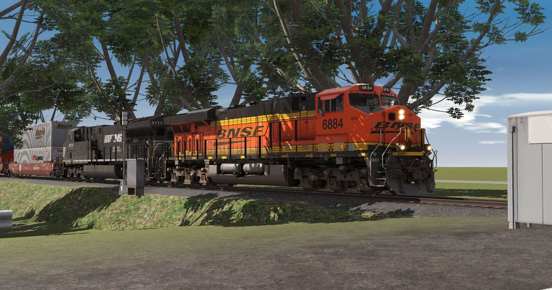 Tags: Trainz Railroad Simulator 2022, REAA, Default, BNSF ES44DC Late, NS ET44AC, 53ft BNSF H2 Wellcar (Single), 53ft BNSF H2 Wellcar Weathered (Single), BNSF 53 Maxi-IV C (weathered), BNSF 53 Maxi-IV B (weathered), BNSF 53 Maxi-IV A (weathered)