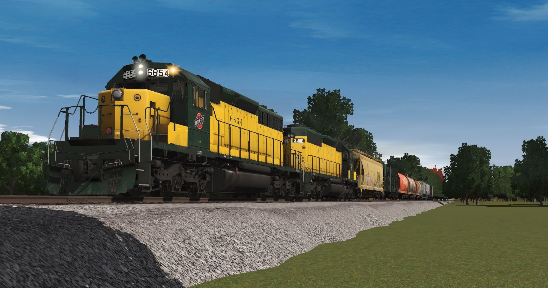 Tags: Trainz Railroad Simulator 2022, REAA, Default, CNW SD40-2, Flying Cam PBR, CNW 4 Bay ACF Centerflow Hopper #490822, CNW 170645 Evans Covered Hopper, CN 111293 cyl covered hopper, CN 377868 Cyl Covered Hopper, CN 605645 Cylindrical Hopper, CRDX Trinity 3 Bay Hopper #7294, CRDX Trinity 3 Bay Hopper #2, CR H51 Covered Hopper Gray (1970s), EOT