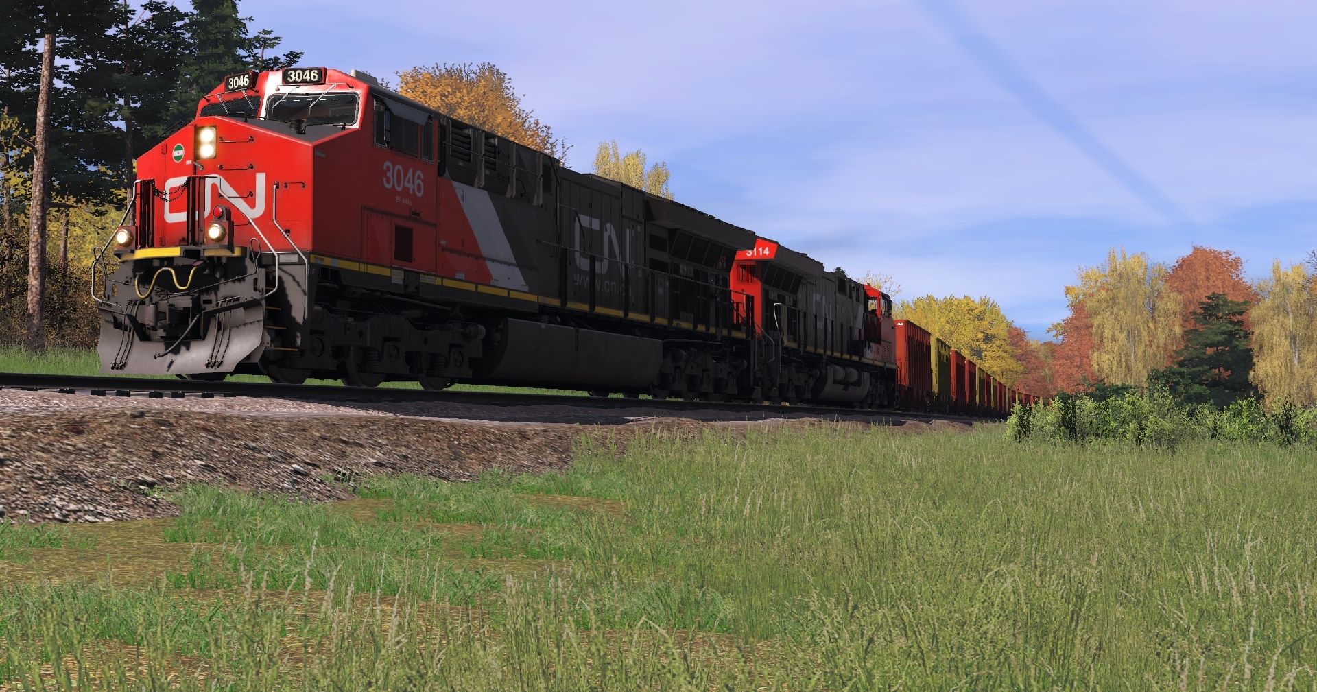 Tags: Trainz Railroad Simulator 2022, Stratton Falls Line, Stratton Falls Line - Default, SD45(SD40M-2) CP #5498, SD45-2 FVLC #2024, NREX ex-ATSF SD45-2u, CN ET44AC, SFRX yellow H1K Hopper, SFRX H1K Hopper, ACRX 60ft HC Boxcar