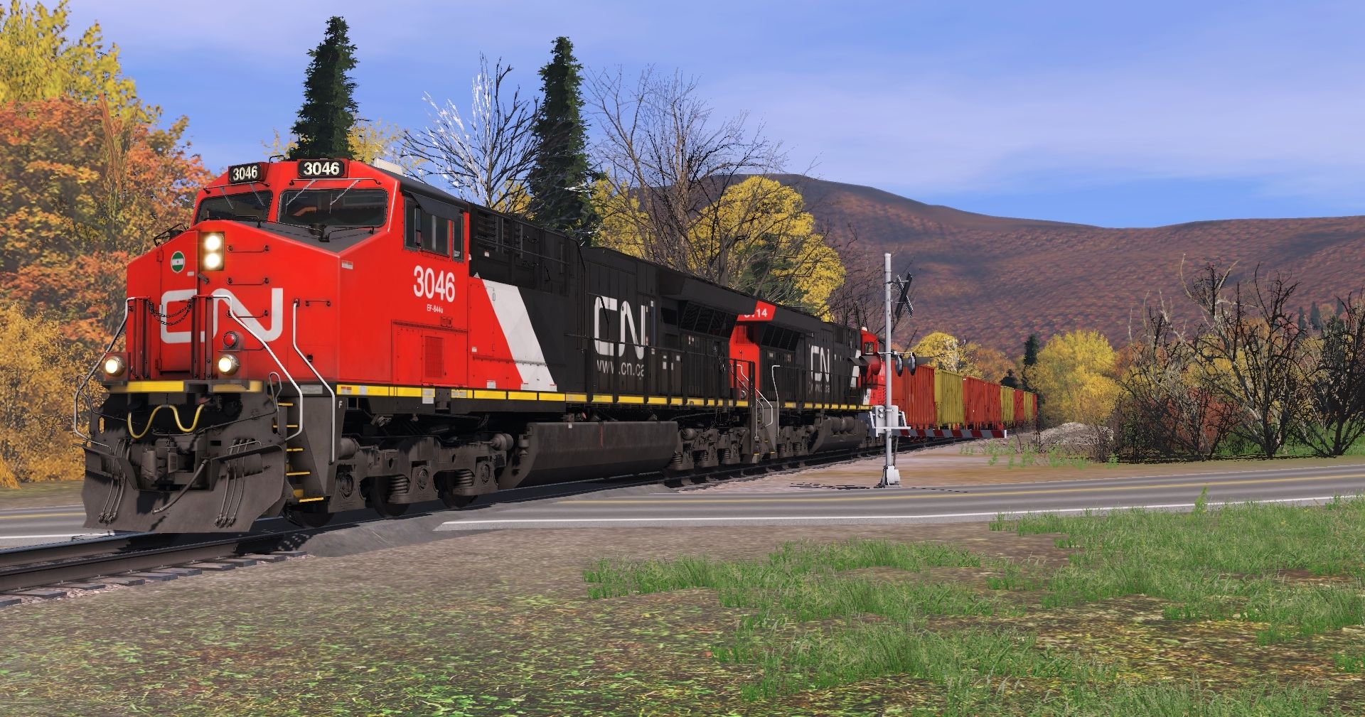 Tags: Trainz Railroad Simulator 2022, Stratton Falls Line, Stratton Falls Line - Default, SD45(SD40M-2) CP #5498, SD45-2 FVLC #2024, NREX ex-ATSF SD45-2u, CN ET44AC, SFRX yellow H1K Hopper, SFRX H1K Hopper, ACRX 60ft HC Boxcar