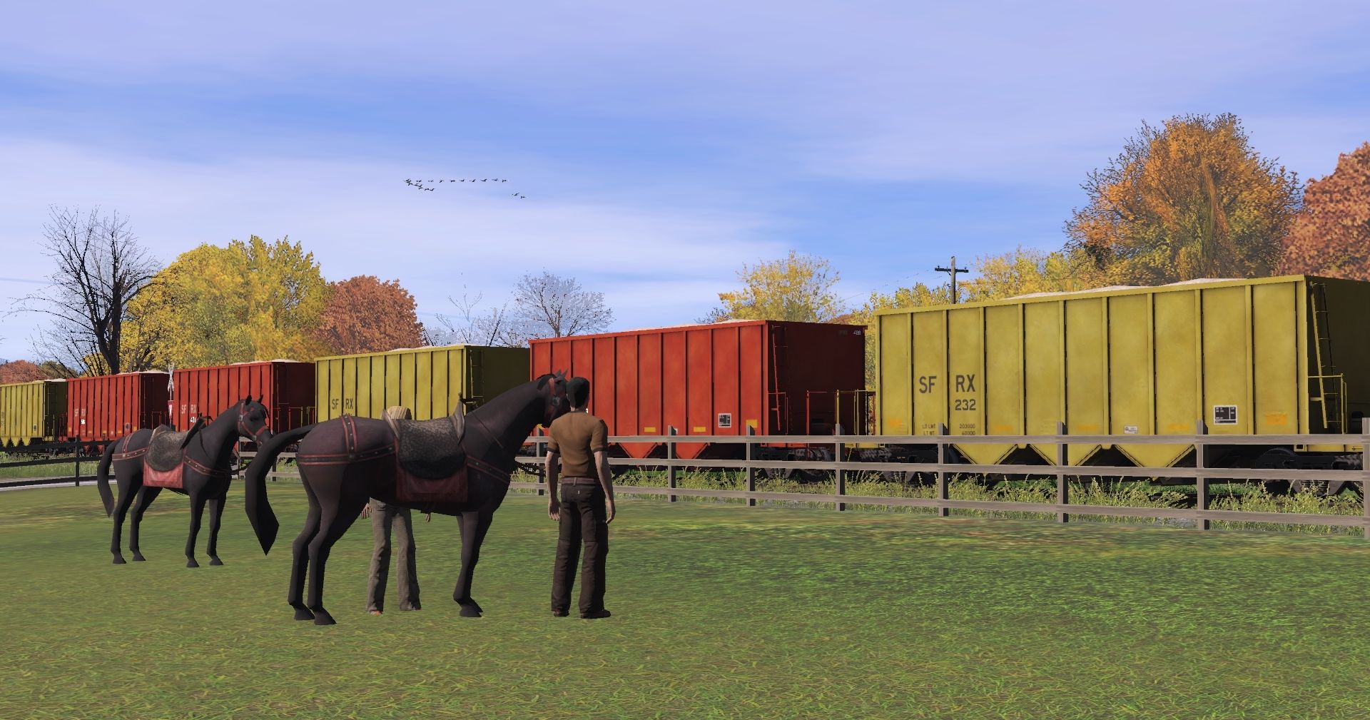 Tags: Trainz Railroad Simulator 2022, Stratton Falls Line, Stratton Falls Line - Default, CN ET44AC, SD45(SD40M-2) CP #5498, SD45-2 FVLC #2024, NREX ex-ATSF SD45-2u, SFRX yellow H1K Hopper, SFRX H1K Hopper, ACRX 60ft HC Boxcar