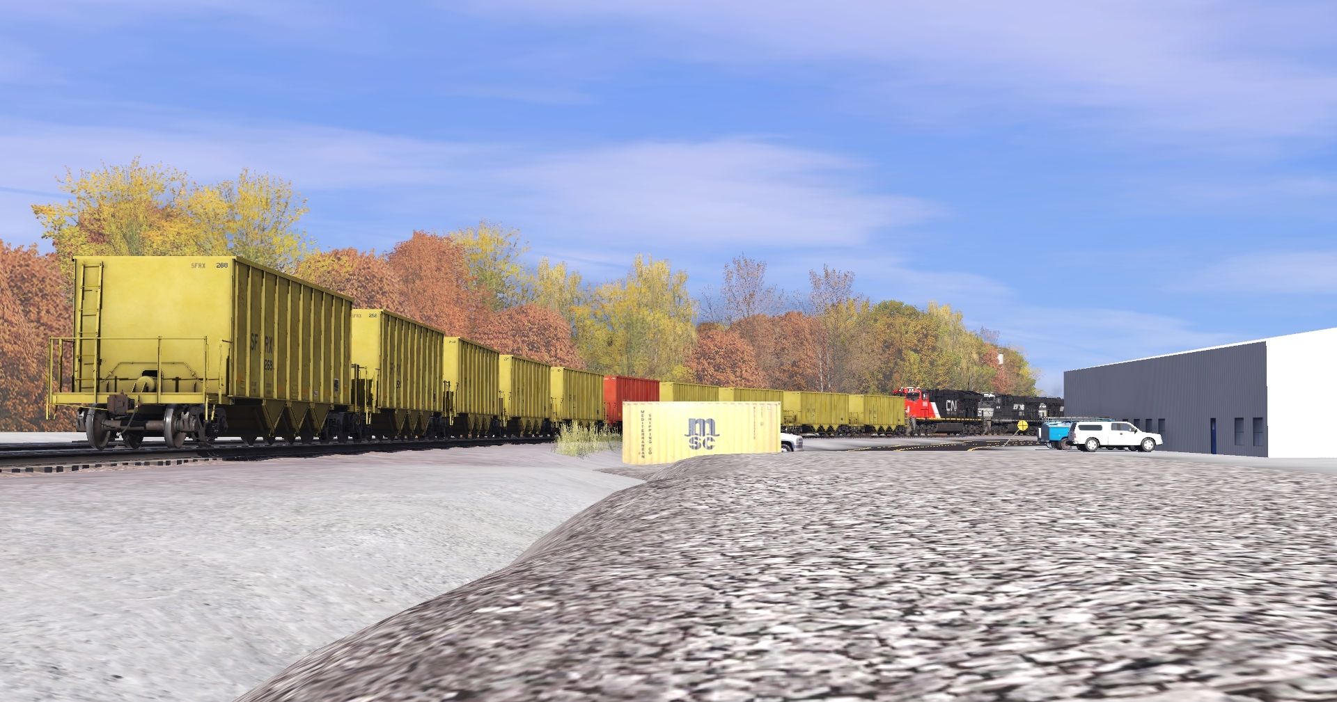 Tags: Trainz Railroad Simulator 2022, Stratton Falls Line, Stratton Falls Line - Default, CN ET44AC, BNSF B40-8 H1 (late), NS ES44AC, NREX ex-ATSF SD45-2u, SD45-2 FVLC #2024, SD45(SD40M-2) CP #5498, SFRX H1K Hopper, SFRX yellow H1K Hopper, ACRX 60ft HC Boxcar