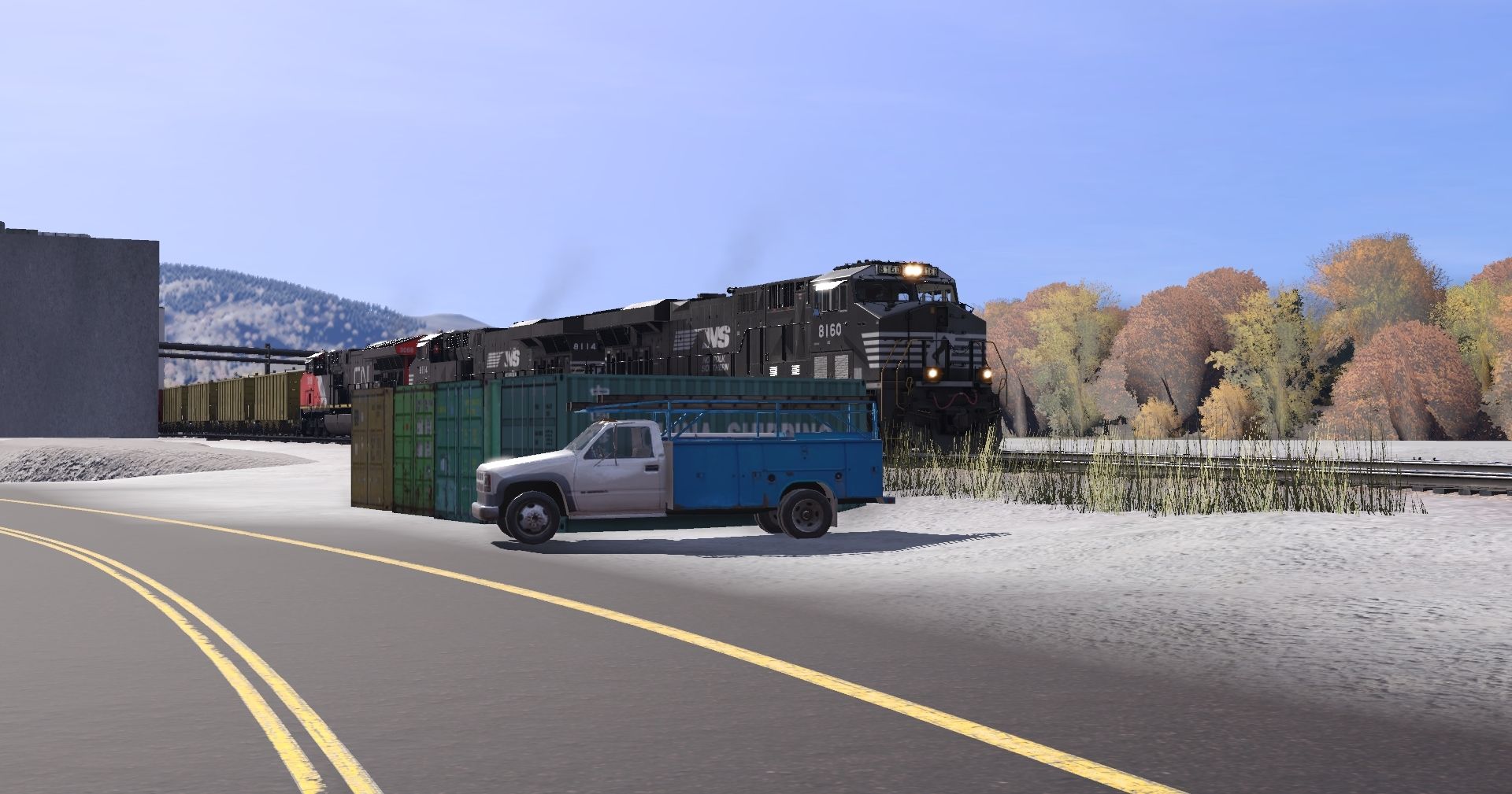 Tags: Trainz Railroad Simulator 2022, Stratton Falls Line, Stratton Falls Line - Default, NS ES44AC, CN ET44AC, BNSF B40-8 H1 (late), NREX ex-ATSF SD45-2u, SD45-2 FVLC #2024, SD45(SD40M-2) CP #5498, SFRX yellow H1K Hopper, SFRX H1K Hopper, ACRX 60ft HC Boxcar