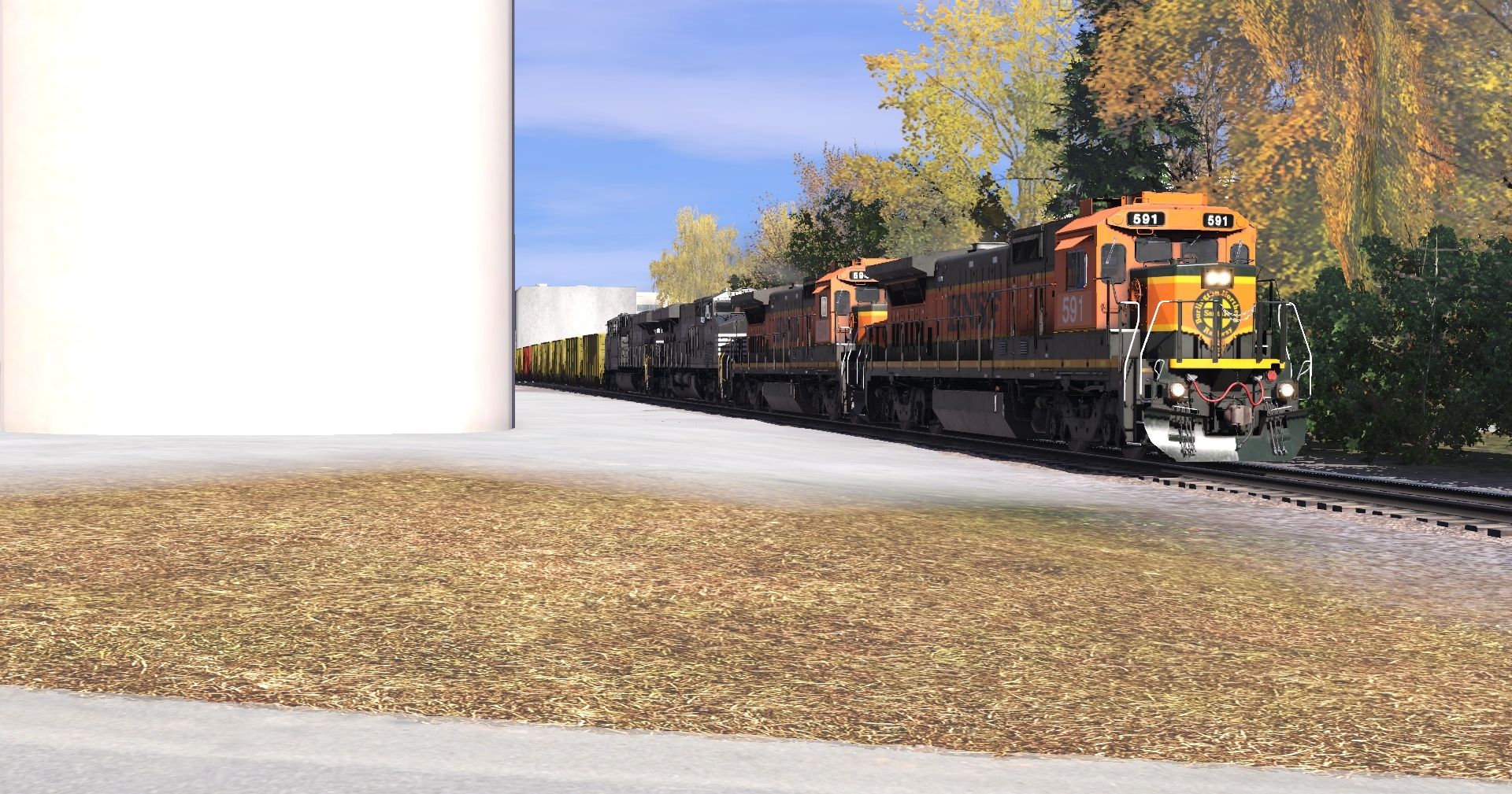 Tags: Trainz Railroad Simulator 2022, Stratton Falls Line, Stratton Falls Line - Default, BNSF B40-8 H1 (late), NS ES44AC, CN ET44AC, NREX ex-ATSF SD45-2u, SD45-2 FVLC #2024, SD45(SD40M-2) CP #5498, SFRX H1K Hopper, SFRX yellow H1K Hopper, EOT, ACRX 60ft HC Boxcar