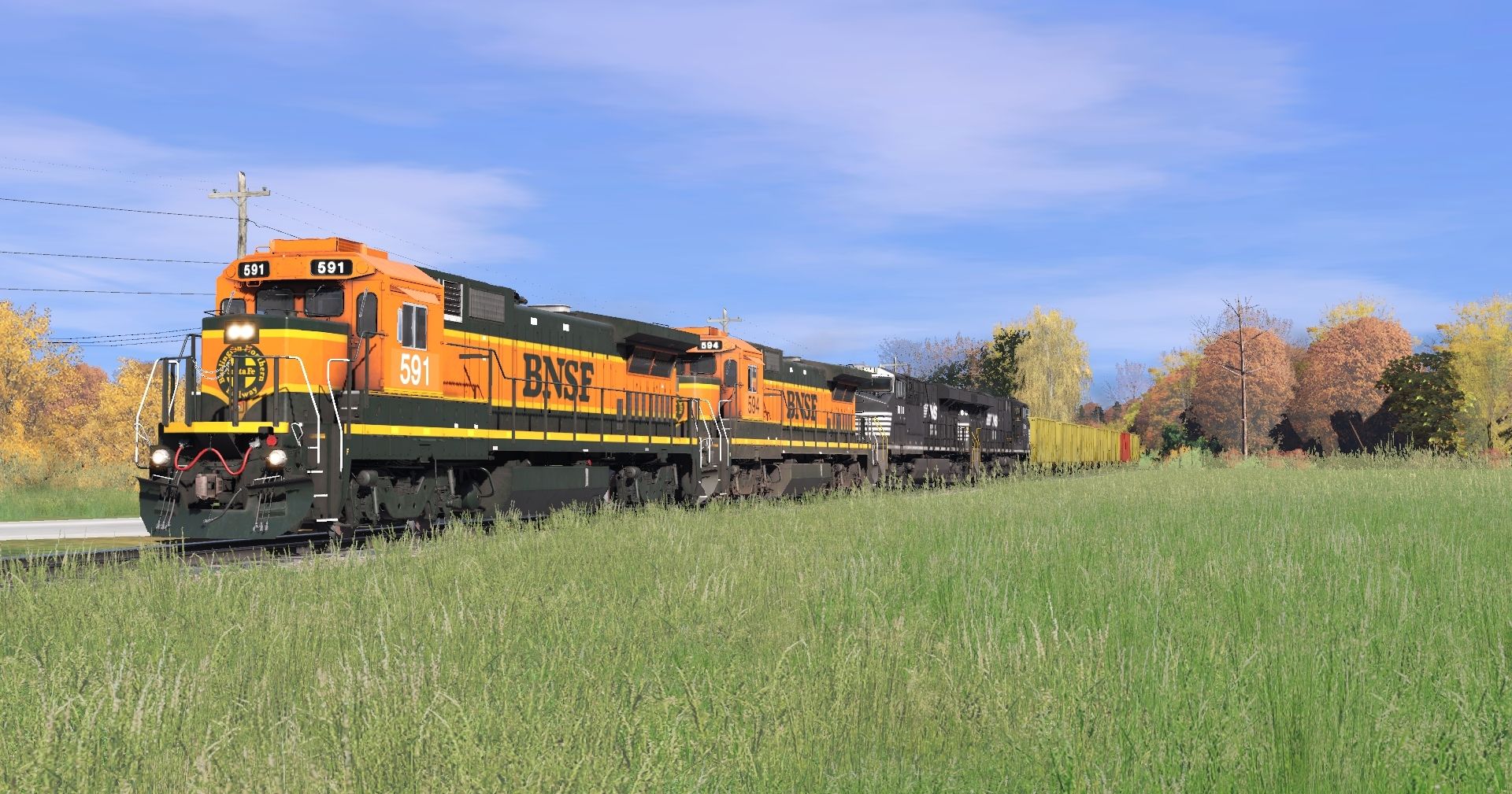 Tags: Trainz Railroad Simulator 2022, Stratton Falls Line, Stratton Falls Line - Default, BNSF B40-8 H1 (late), NS ES44AC, CN ET44AC, NREX ex-ATSF SD45-2u, SD45-2 FVLC #2024, SD45(SD40M-2) CP #5498, SFRX H1K Hopper, SFRX yellow H1K Hopper, EOT, ACRX 60ft HC Boxcar