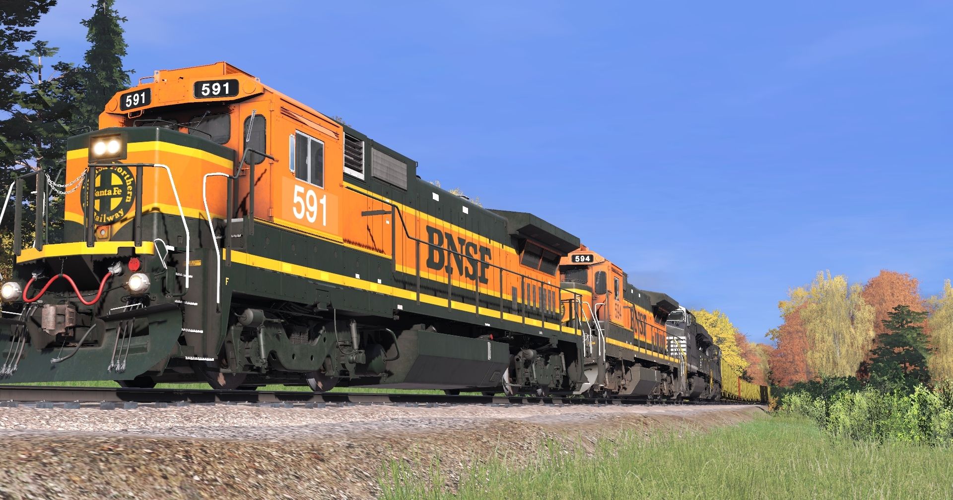 Tags: Trainz Railroad Simulator 2022, Stratton Falls Line, Stratton Falls Line - Default, BNSF B40-8 H1 (late), NS ES44AC, SD45(SD40M-2) CP #5498, SD45-2 FVLC #2024, NREX ex-ATSF SD45-2u, CN ET44AC, SFRX H1K Hopper, SFRX yellow H1K Hopper, EOT, ACRX 60ft HC Boxcar