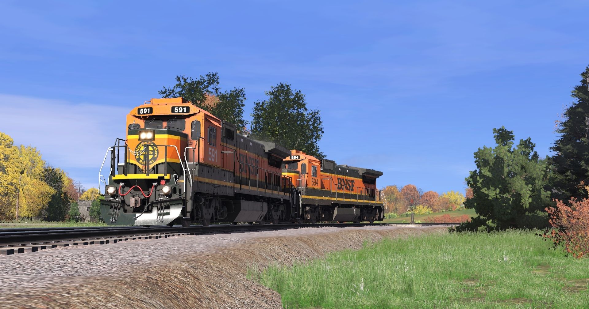 Tags: Trainz Railroad Simulator 2022, Stratton Falls Line, Stratton Falls Line - Default, BNSF B40-8 H1 (late), NS ES44AC, SD45(SD40M-2) CP #5498, SD45-2 FVLC #2024, NREX ex-ATSF SD45-2u, CN ET44AC, SFRX H1K Hopper, SFRX yellow H1K Hopper, EOT, ACRX 60ft HC Boxcar