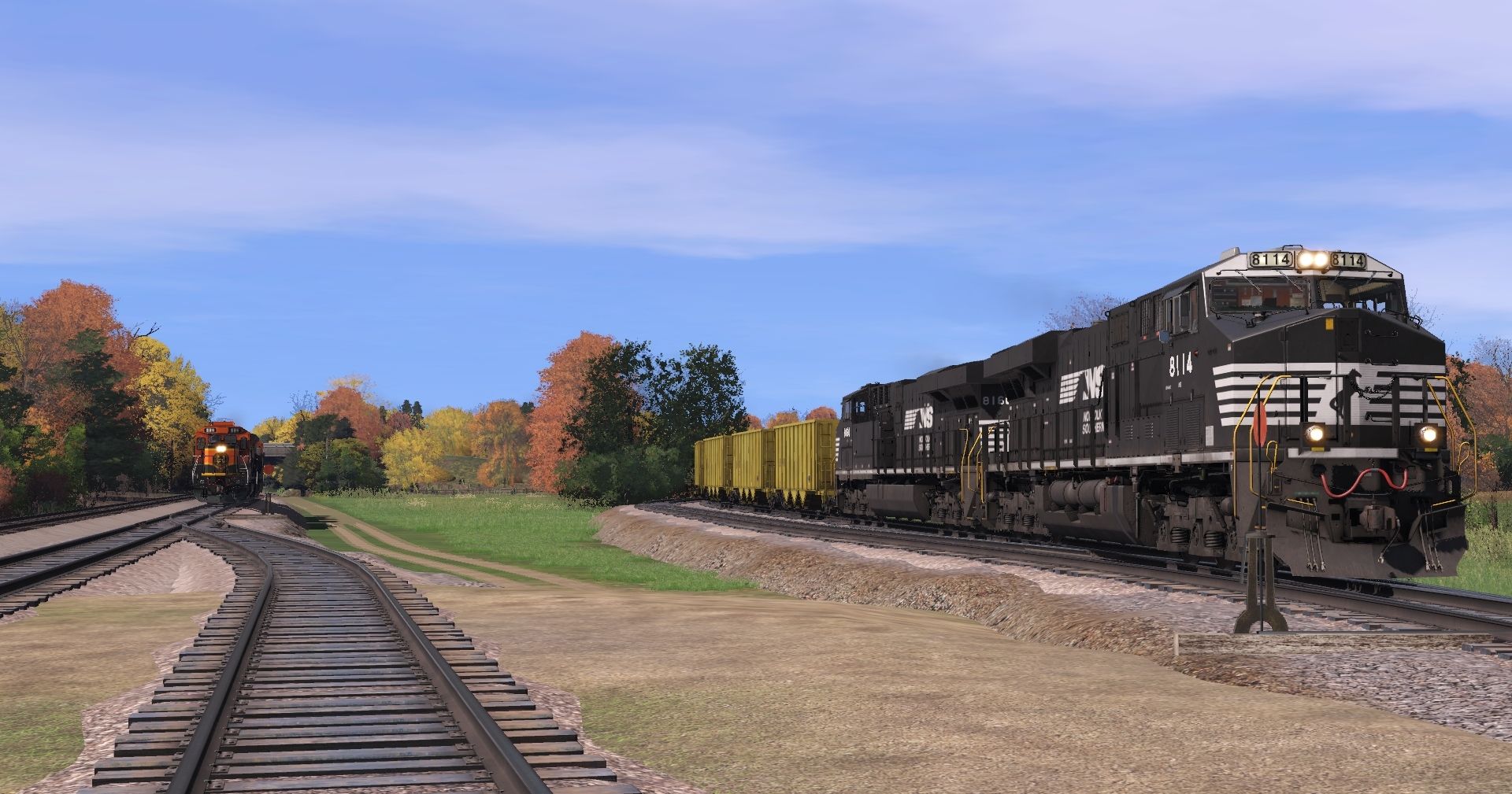 Tags: Trainz Railroad Simulator 2022, Stratton Falls Line, Stratton Falls Line - Default, NS ES44AC, BNSF B40-8 H1 (late), SD45(SD40M-2) CP #5498, SD45-2 FVLC #2024, NREX ex-ATSF SD45-2u, SFRX H1K Hopper, SFRX yellow H1K Hopper, ACRX 60ft HC Boxcar