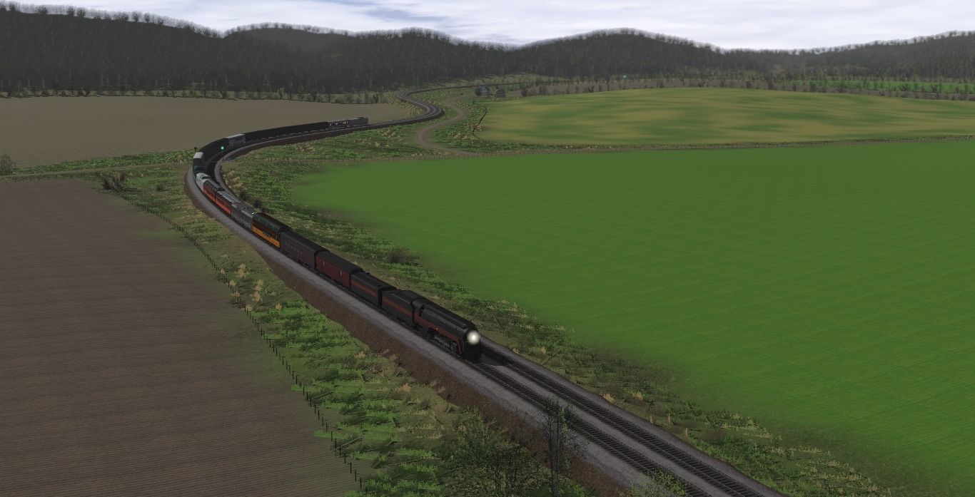 Tags: Trainz Railroad Simulator 2022, Appalachian Right of Way verison 1.0, NS Steam Scenes - Early April 2017 (Reworked), N&W J Class Engine, NS ES44AC, N&W J Class Tender, N&W J Class Aux Tender, N&W Tool Car #1407, NS HEP Power Car Tennessee, SLRG Budd Dome Scenic View, B&O dome, MILW 07 Diner Wisconsin Valley, MILW 08 Super Dome, CB&Q California Zephyr - 4720