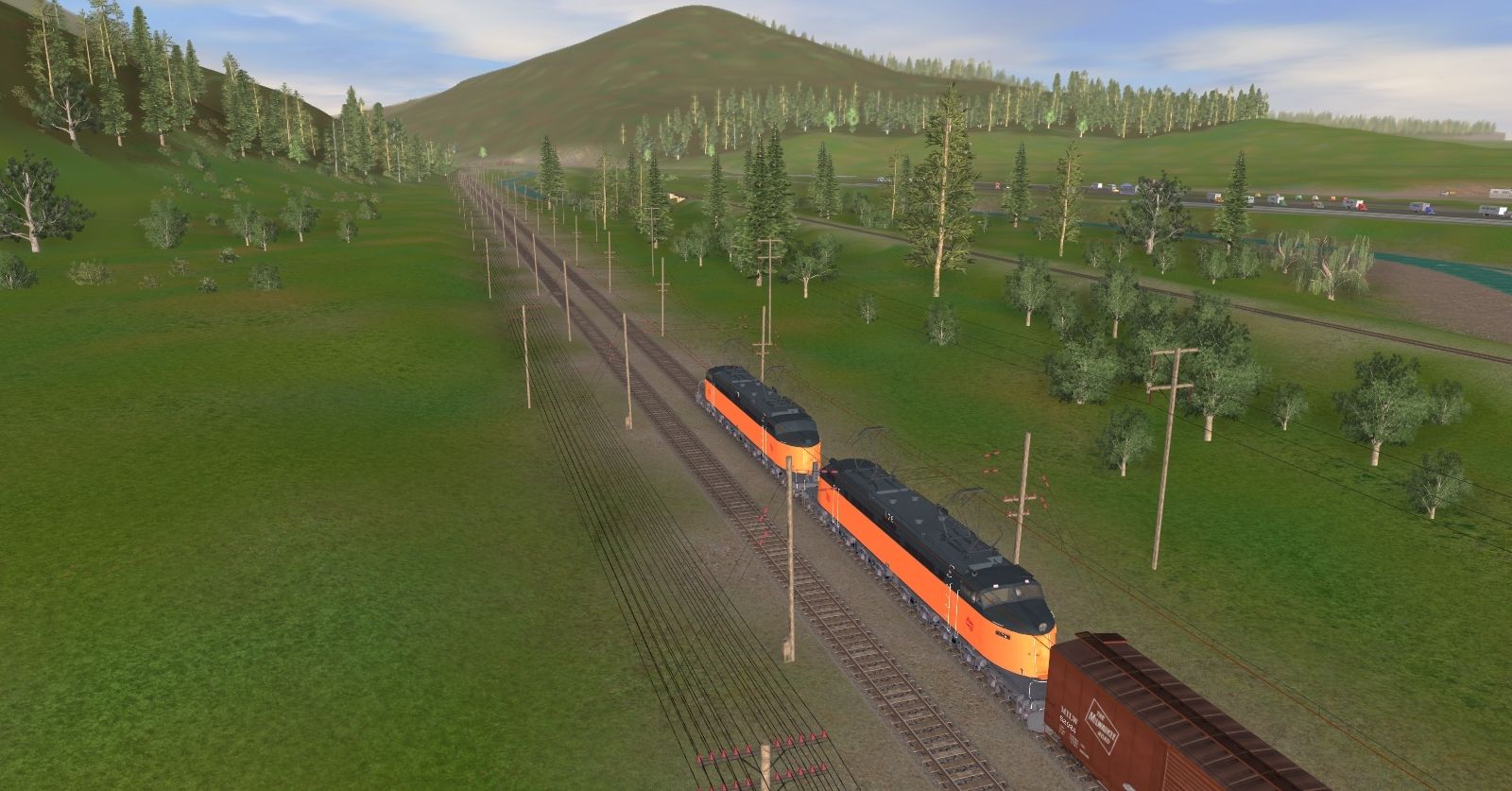 Tags: Trainz: A New Era, Milwaukee Road Avery-Drexel, MILW - Transcontinental Westbound Freight Train (summer time), TUME-71001753-MILW-EF4, TUME-71402175-SD40-2-BN, TUME-300502-Boxcar-50ft-MILW, TUME-300501-Boxcar-50ft-MILW, TUME-300503-Boxcar-50ft-MILW, TUME-300504-Boxcar-50ft-MILW, TUME-300592-Flatcar-MILW, TUME-300595-Flatcar-UP, TUME-300598-Flatcar-UP, TUME-300596-Logging-Flatcar-UP, TUME-300599-Logging-Flatcar-UP