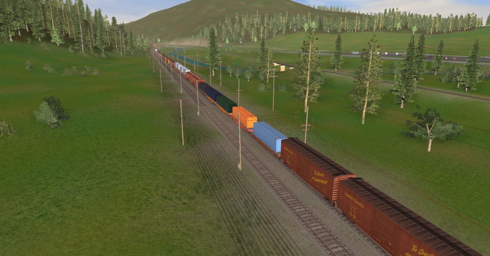 Tags: Trainz: A New Era, Milwaukee Road Avery-Drexel, MILW - Transcontinental Westbound Freight Train (summer time), TUME-710022902-EF1-29B, TUME-710032902-EF1-29C, TUME-710012902-EF1-29A, TUME-71001753-MILW-EF4, TUME-71402175-SD40-2-BN, TUME-300596-Logging-Flatcar-UP, TUME-300599-Logging-Flatcar-UP, TUME-300591-Trailer-Flatcar-MILW, TUME-300583-Centerbeam-WP, TUME-300584-Centerbeam-UP, TUME-300531-Tank-Car-MILW