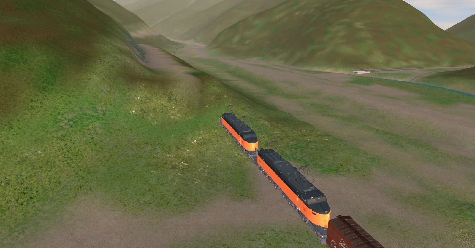 Tags: Trainz: A New Era, Milwaukee Road Avery-Drexel, MILW - Transcontinental Westbound Freight Train (summer time), TUME-71001753-MILW-EF4, TUME-71402175-SD40-2-BN, TUME-300502-Boxcar-50ft-MILW, TUME-300501-Boxcar-50ft-MILW, TUME-300503-Boxcar-50ft-MILW, TUME-300504-Boxcar-50ft-MILW, TUME-300592-Flatcar-MILW, TUME-300595-Flatcar-UP, TUME-300596-Logging-Flatcar-UP, TUME-300599-Logging-Flatcar-UP, TUME-300514-Boxcar-50ft-CN